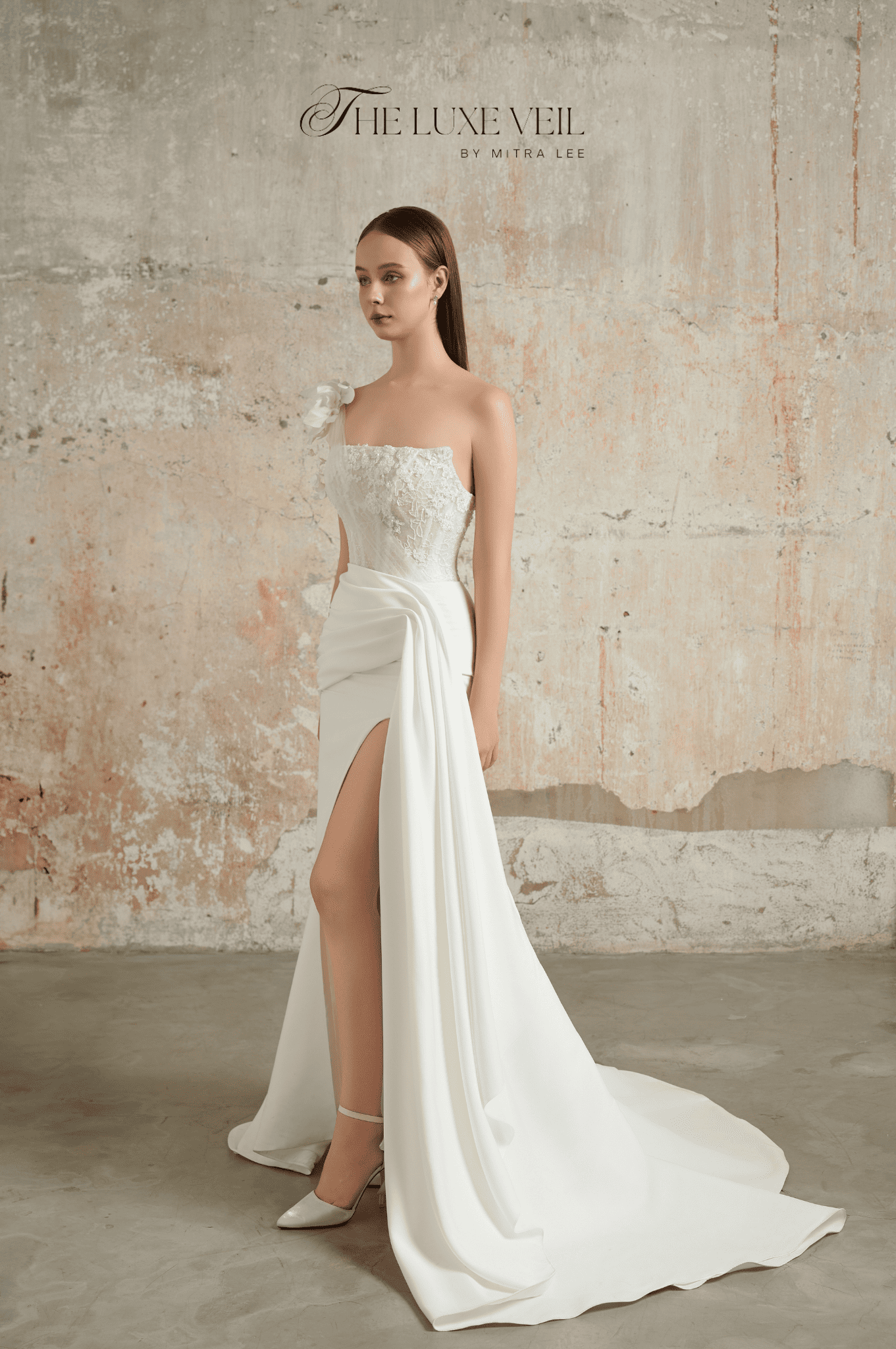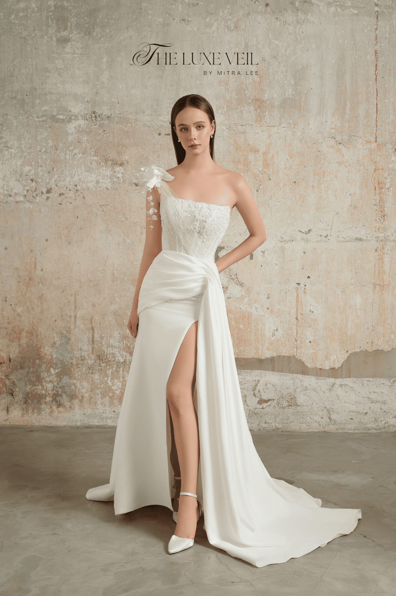 Step into a world of timeless beauty with this breathtaking one-shoulder bridal masterpiece. Designed for the modern yet romantic bride, this gown effortlessly blends sophistication with a touch of whimsy. The intricate lace bodice, adorned with delicate floral appliqué, captures the essence of nature’s purity, while the flowing drape cascades gracefully like a whisper of magic. The high slit introduces a bold and daring charm, celebrating a bride who isn’t afraid to embrace her unique elegance. Every step you take in this gown tells a story of confidence, grace, and enchantment. Let this gown be more than just a dress—it’s a statement of your individuality, a reflection of your inner light, and a piece of art that transforms your wedding day into a fairytale come to life.