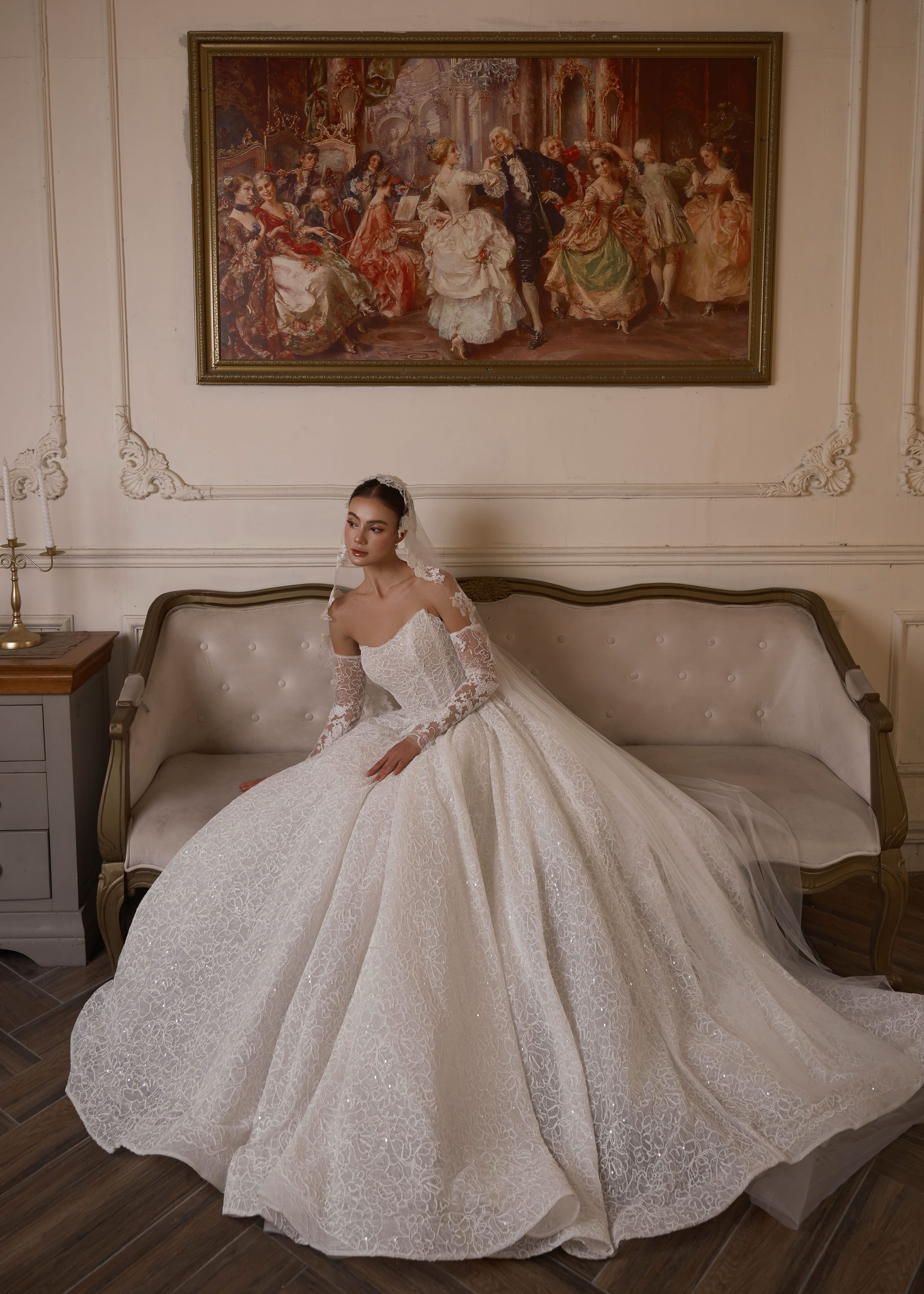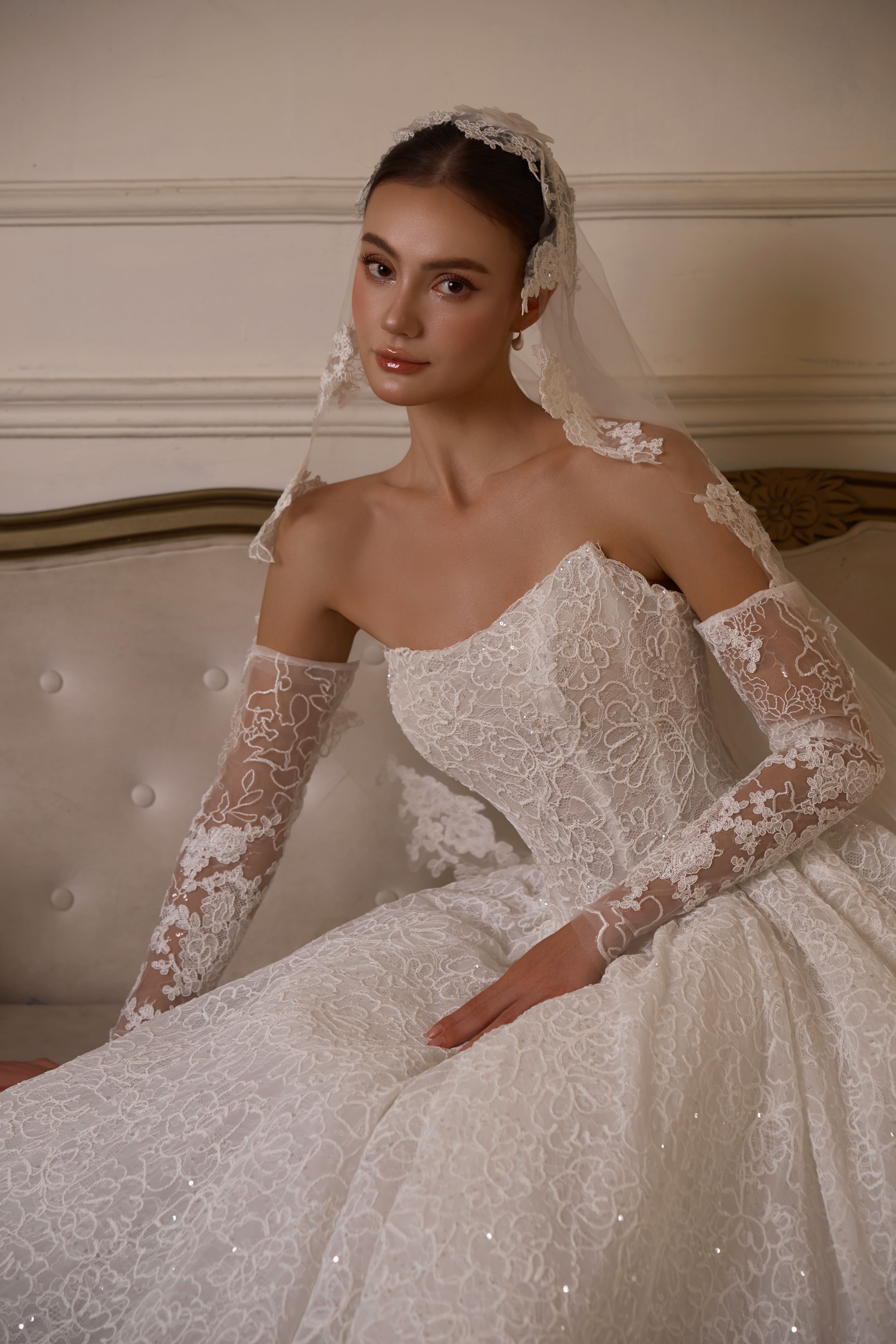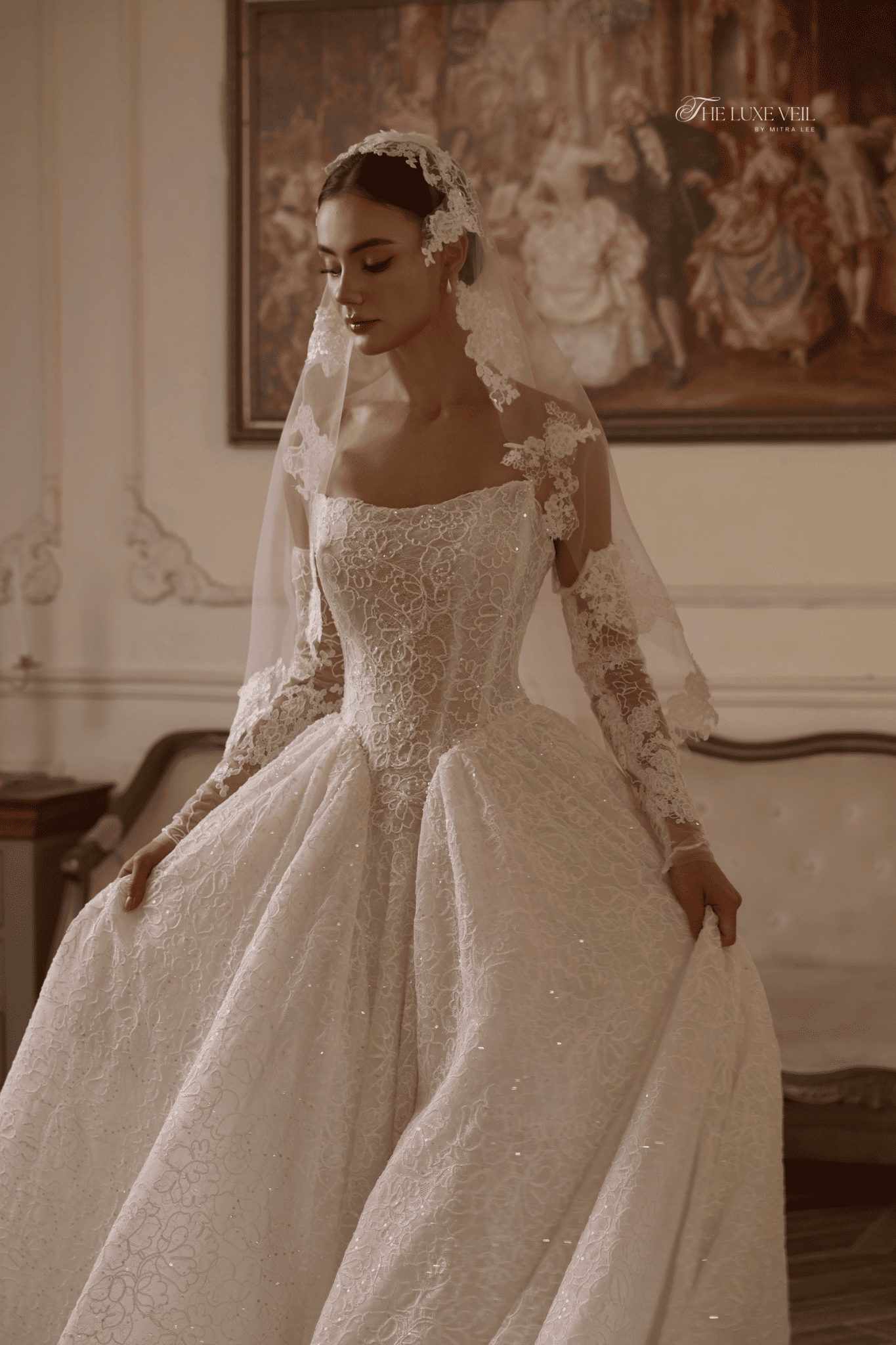 Charlotte feels like a scene from an old palace, paused in time. Layers of delicate lace cascade into a full, sweeping skirt, shimmering softly as they catch the light — graceful, romantic, and endlessly elegant. The corseted bodice shapes the waist with refinement, while lace sleeves and a gentle neckline frame the bride with modest beauty. Every detail speaks of tradition, of love cherished slowly, of vows meant to last a lifetime. With her veil falling quietly behind her, Charlotte becomes the embodiment of a classic princess — soft-spoken, composed, and undeniably regal. Charlotte is for the bride who has always dreamed of fairytales. She believes in romance that is gentle, patient, and everlasting, and she walks into forever with grace.