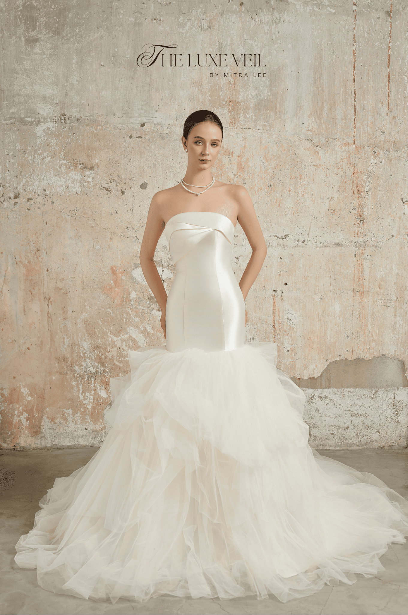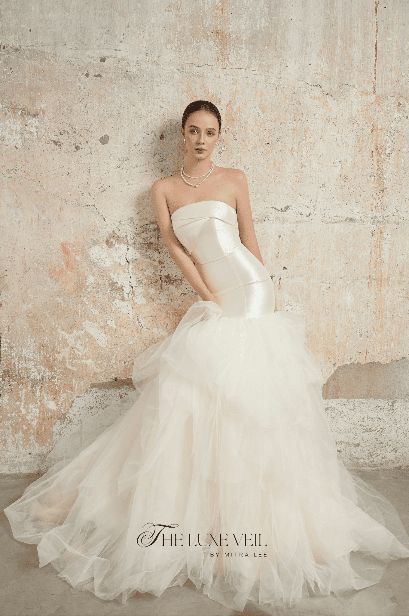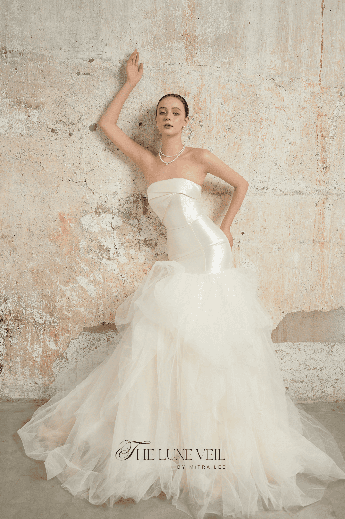Simplicity speaks volumes in this strapless mermaid gown, meticulously crafted to highlight your natural beauty. The structured bodice features subtle detailing that radiates sophistication, complemented by layers of airy tulle for a touch of dreamlike charm. Pair it with a classic pearl necklace to complete your look of effortless grace. Perfect for the bride who believes in less is more and elegance is forever.