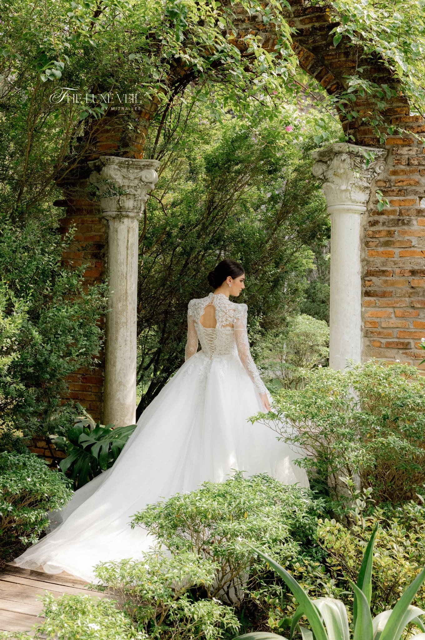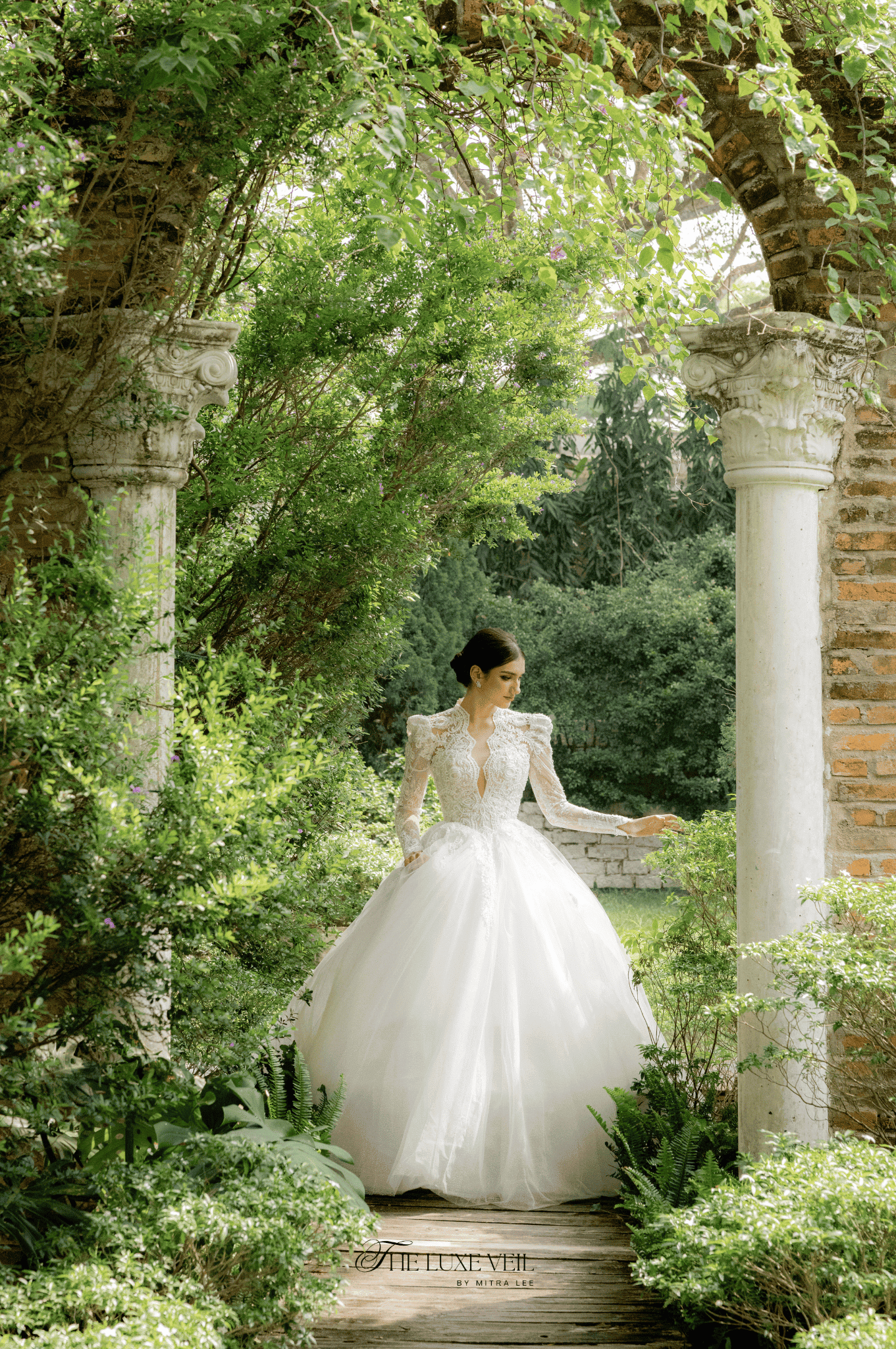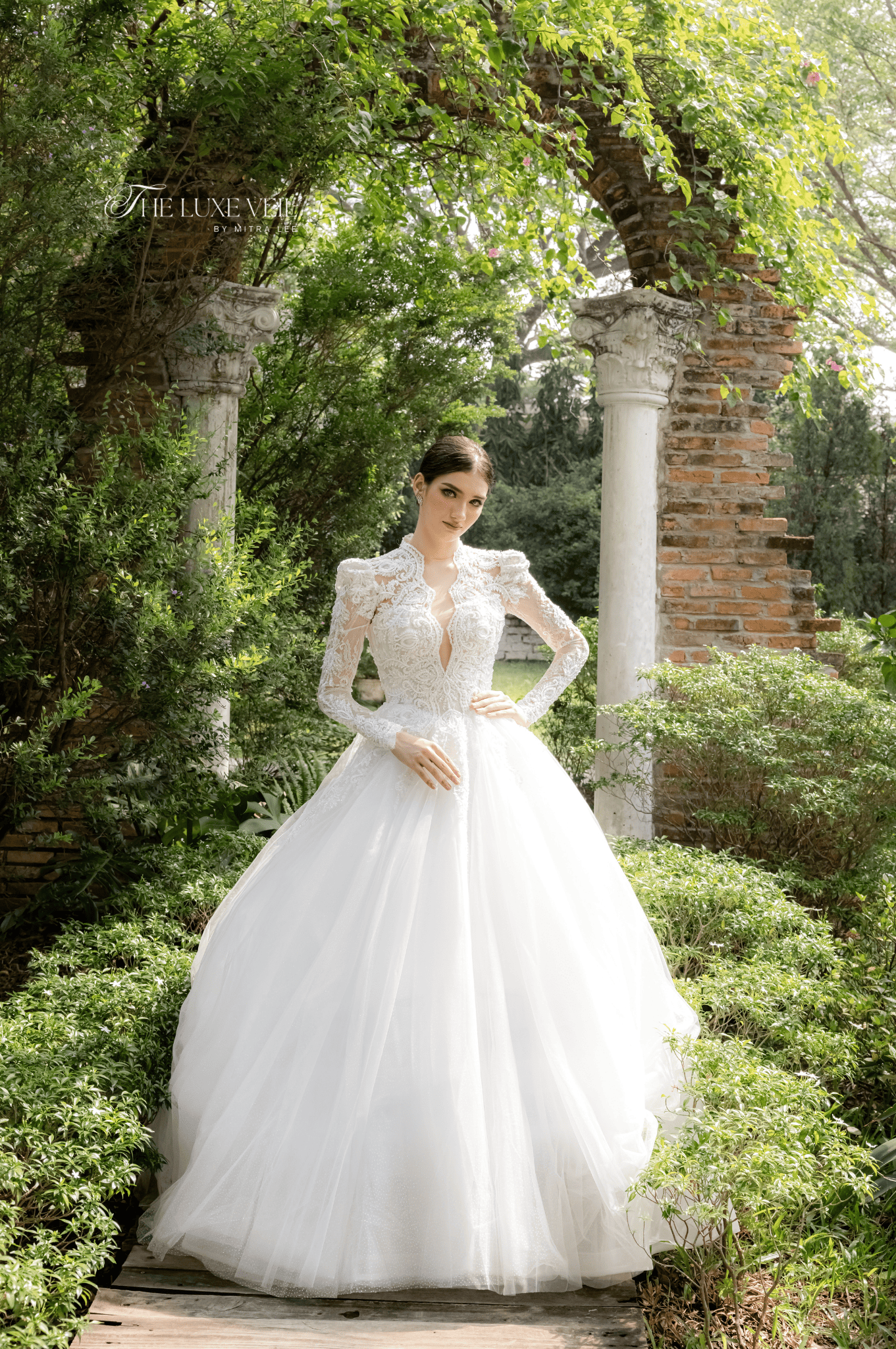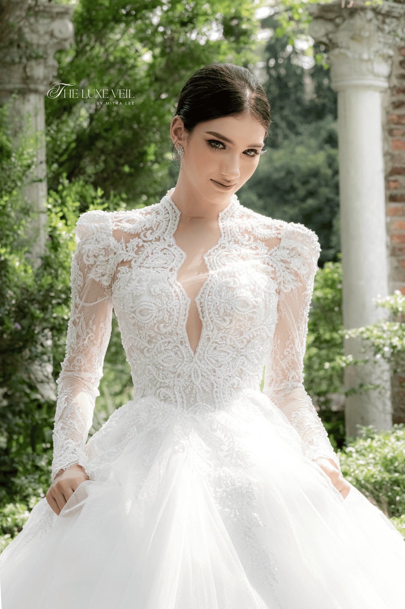 Eleonora is the gown of a bride who carries herself like royalty: graceful, poised, and unafraid to make a statement. The high-collared lace bodice, detailed with regal embroidery and a daring keyhole neckline, perfectly balances tradition with modern allure. Strong-shouldered long sleeves bring structure and drama, while the full tulle skirt softens the silhouette with airy lightness. Crafted for the woman who commands attention effortlessly, this design is both romantic and powerful—an ode to queens of the past and the legacies of the future. Let the world pause when you pass, this is more than a dress. It is presence, power, and poetry.