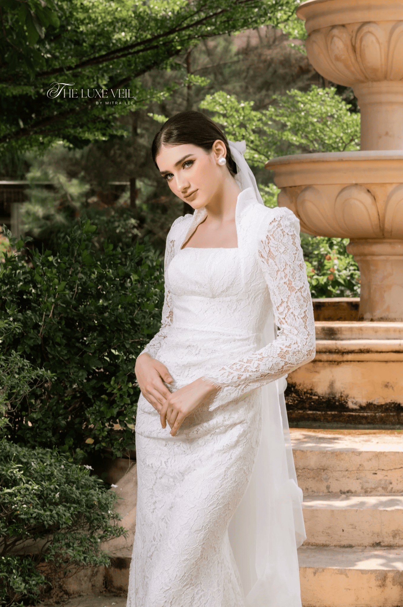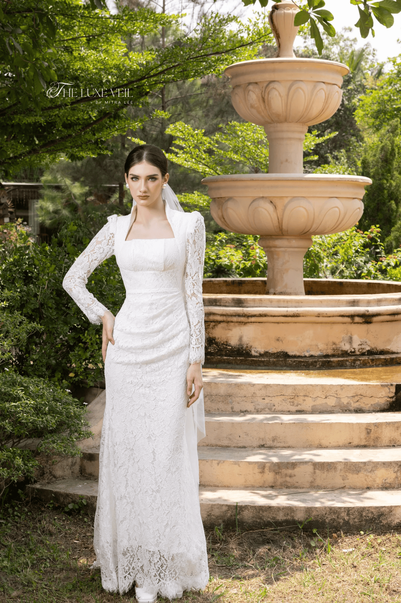 This is a tribute to timeless sophistication and modern grace. Designed for the confident and elegant bride, Vivienne features a structured silhouette crafted from delicate floral lace, exuding both classic charm and contemporary refinement. The square neckline and fitted bodice accentuate the natural curves, while the long lace sleeves and tailored bolero jacket add a regal touch. The intricate lace detailing throughout the dress creates a sense of vintage romance, complemented by a flowing veil that enhances the bridal aura. Vivienne is perfect for the bride who seeks a balance between tradition and bold individuality, making an unforgettable statement of grace and strength.