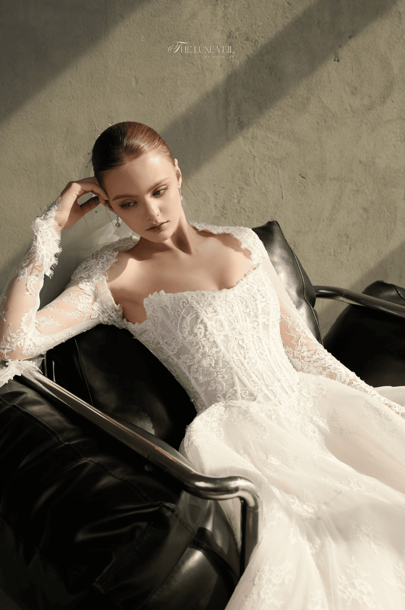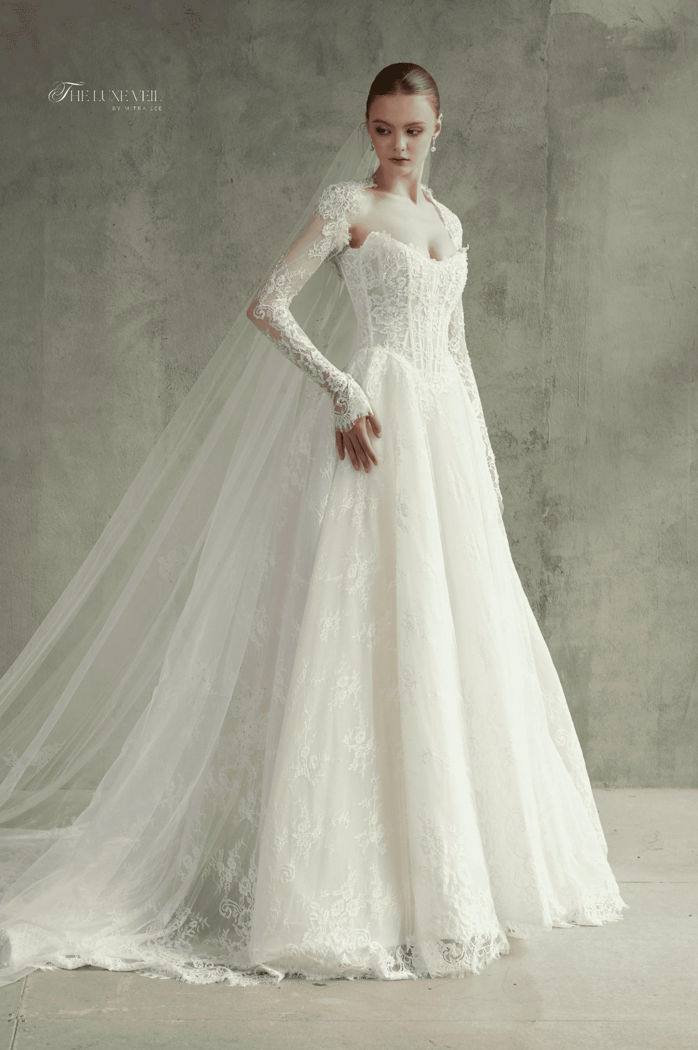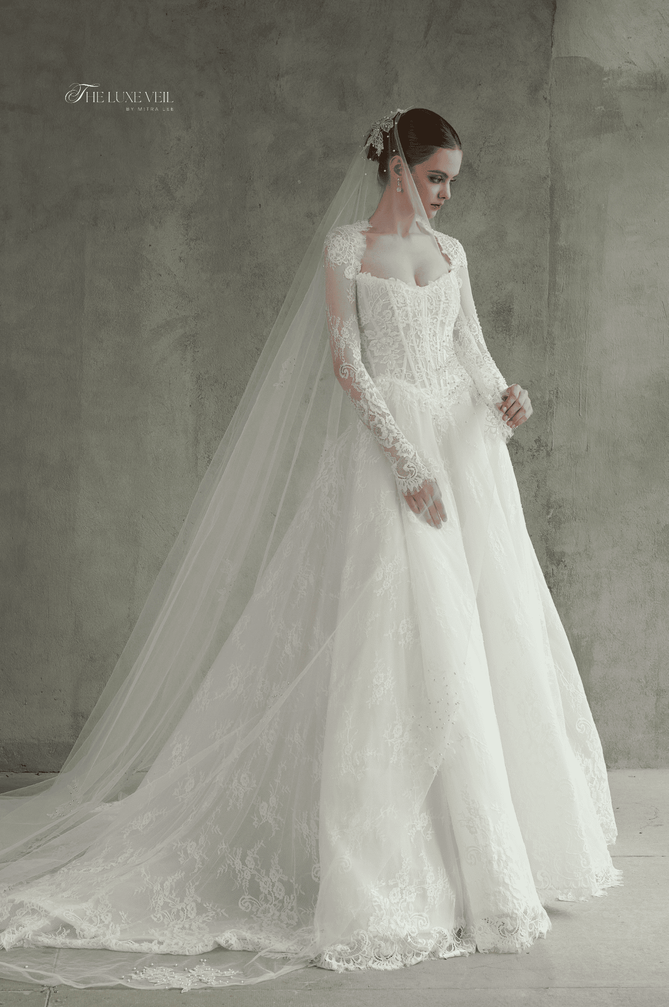 Clarisse is a vision of timeless romance and refined grace. With its intricately embroidered corset bodice and long lace sleeves, this gown captures the delicate strength of femininity. The structured silhouette flows into a sweeping lace skirt and cathedral veil, creating a breathtaking aura of elegance and majesty. For the bride who embodies poise, confidence, and a quiet kind of power, Clarisse is more than a gown, it is an heirloom of beauty, meant to be remembered for generations.