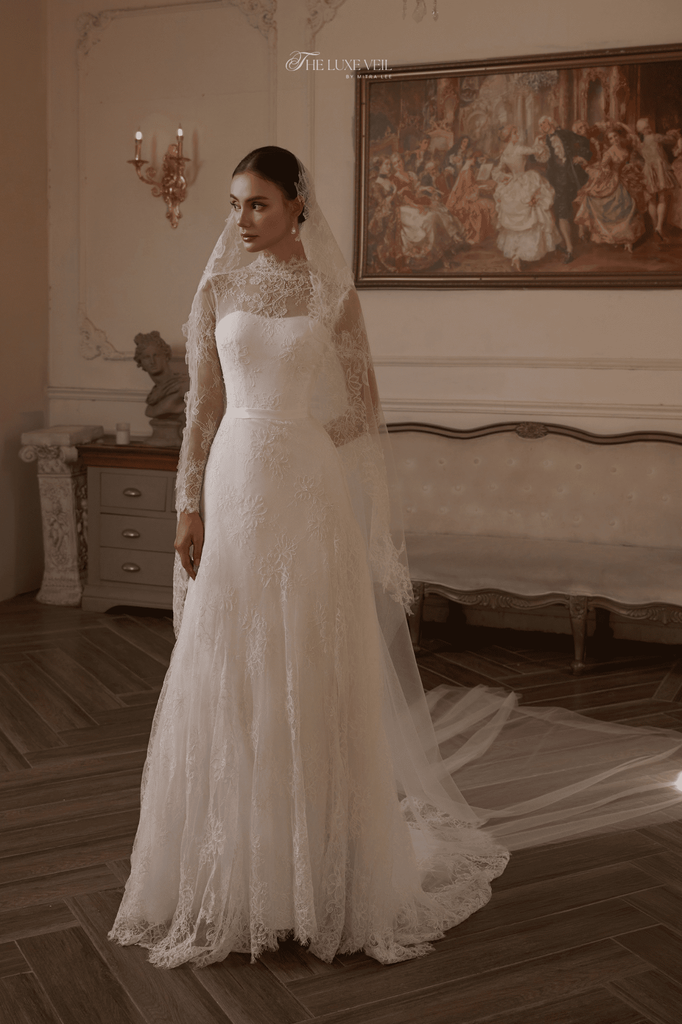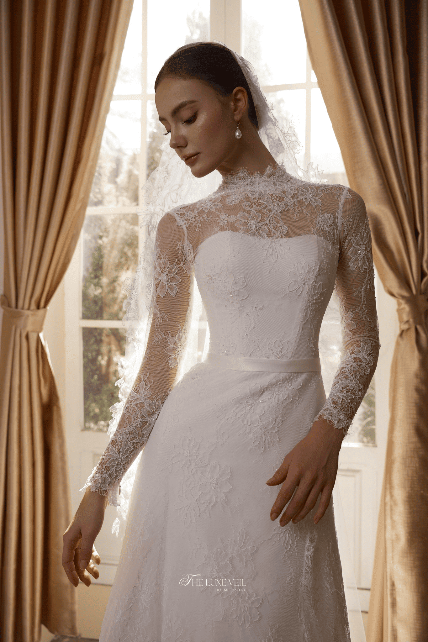 Alexandrine is royalty in its most graceful form. Intricate lace rests softly against the skin, composed and deliberate, as if shaped for grand halls and quiet vows alike. The high neckline and long sleeves create a regal frame, while the refined silhouette moves with calm authority: elegant, poised, and unwavering. Her veil falls like a royal decree, light yet commanding, completing a look that feels ceremonial, dignified, and timeless. Alexandrine is for the bride who carries strength with softness. She does not seek the spotlight, it follows her naturally.