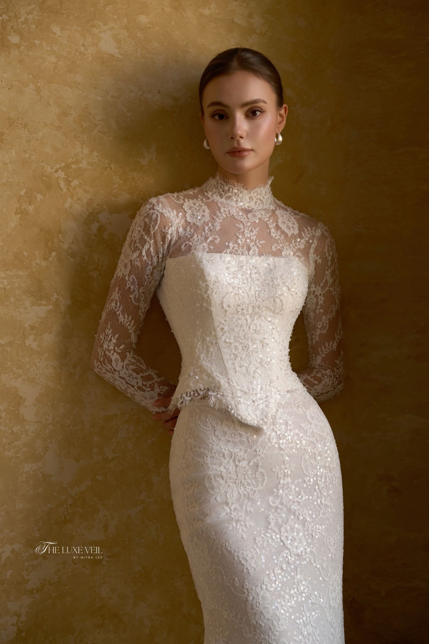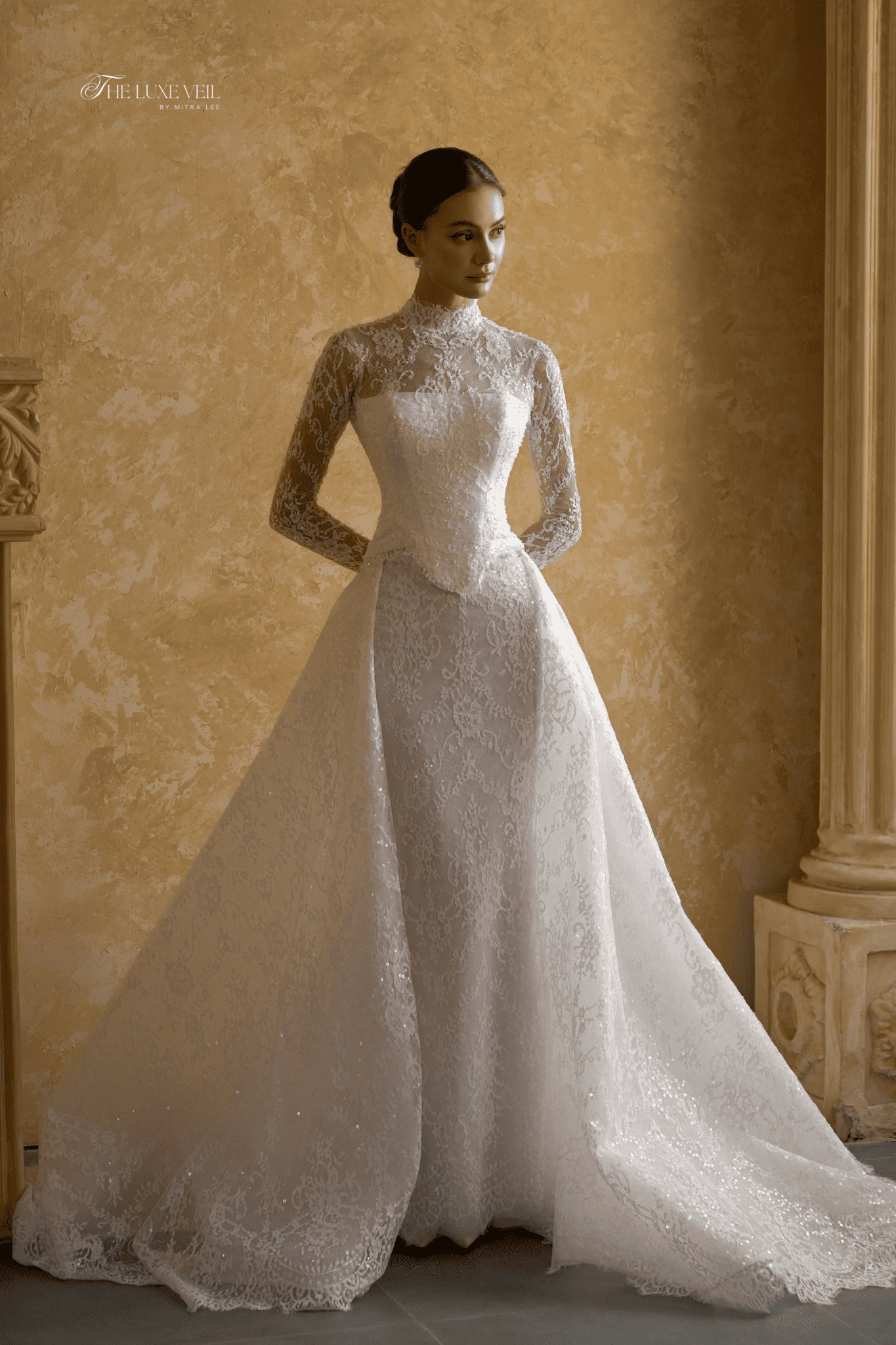 Marguerite is a love story told in quiet details. Delicate lace drapes the body with a softness that feels almost timeless, as if the gown has lived many beautiful moments before this one. Her high neckline and long sleeves speak of grace and restraint, while the sculpted waist gently shapes the silhouette, balancing tradition with femininity. When the overskirt falls into place, Marguerite transforms, subtle, ceremonial, and effortlessly elegant. Marguerite is for the bride who believes romance doesn’t need to be loud. She stands calmly, confidently, and lets love unfold at its own pace.