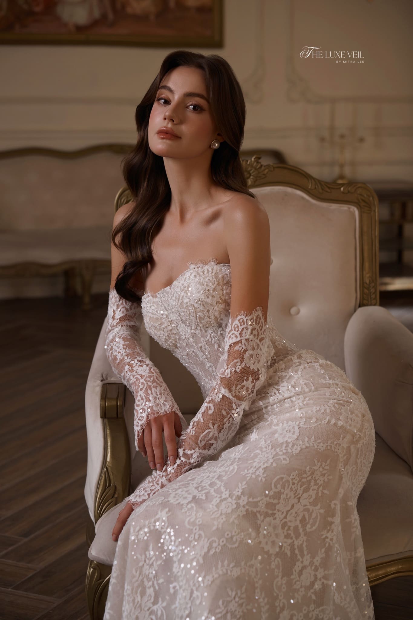 Roselyn feels like a love story written in lace. Soft florals trace the gown with quiet romance, wrapping the silhouette in delicacy and warmth, as if every stitch was made with intention. The corseted bodice shapes the waist gently, while sheer lace sleeves soften the look with a vintage tenderness. Subtle shimmer catches the light as she moves, creating a glow that feels intimate, graceful, and effortlessly feminine. With a flowing overskirt trailing behind, Roselyn transforms — romantic yet confident, refined yet deeply emotional Roselyn is for the bride who believes in love that grows slowly and lasts forever. She doesn’t rush the moment. She lets it bloom.