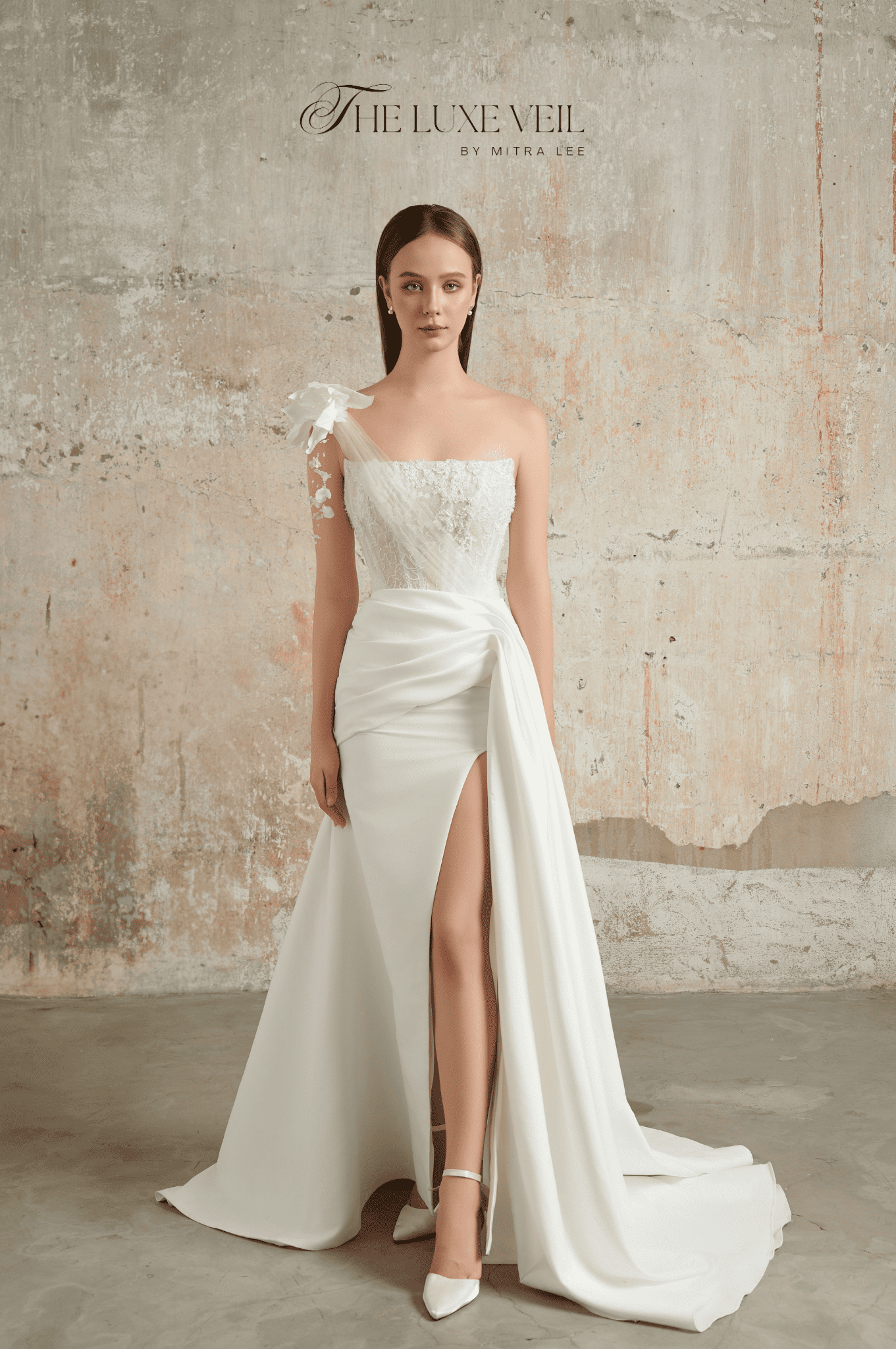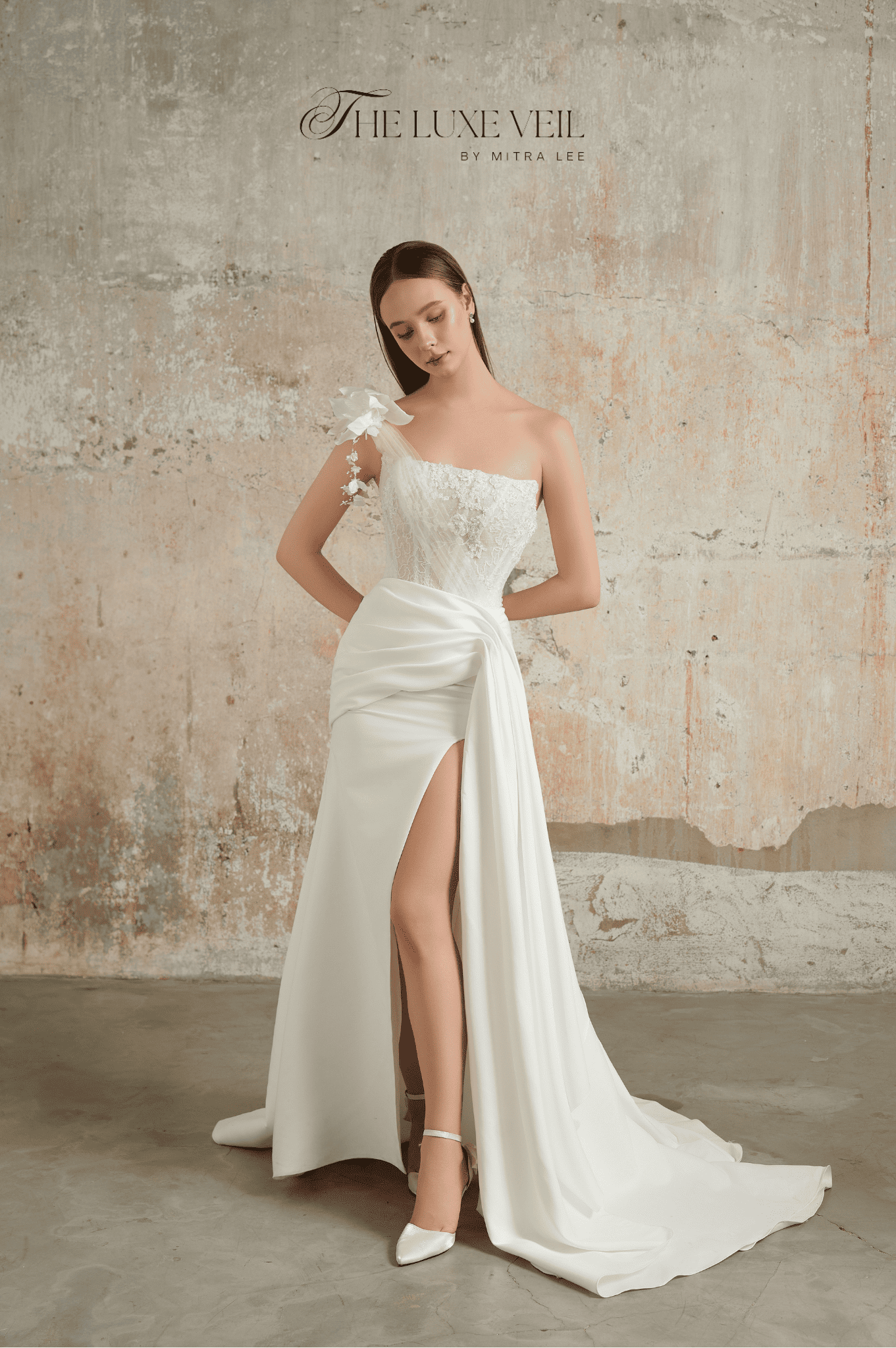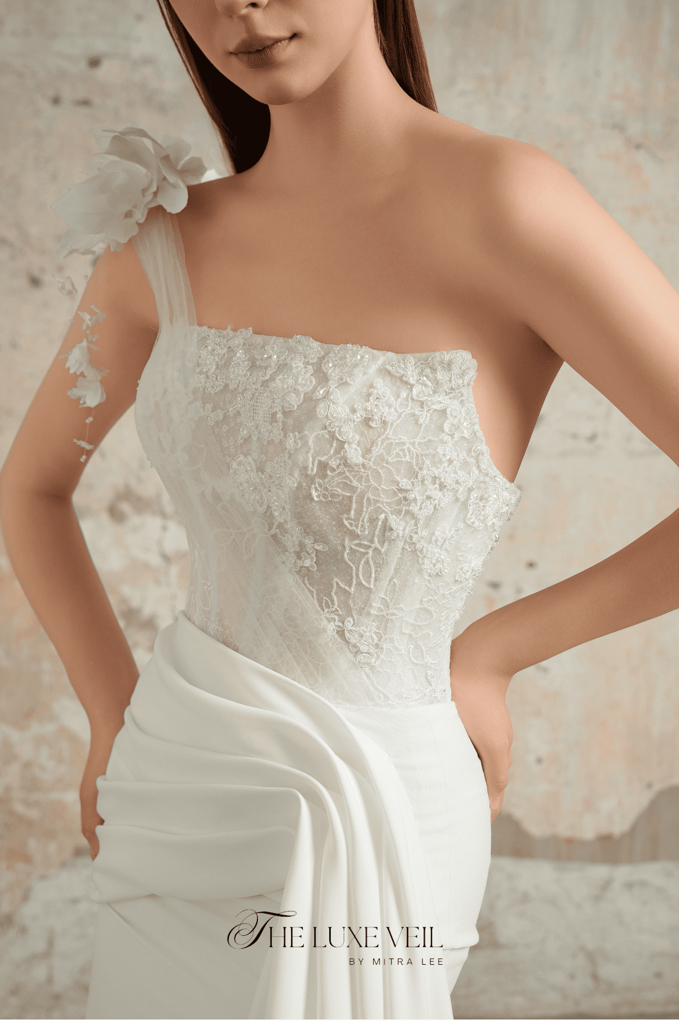 Step into a world of timeless beauty with this breathtaking one-shoulder bridal masterpiece. Designed for the modern yet romantic bride, this gown effortlessly blends sophistication with a touch of whimsy. The intricate lace bodice, adorned with delicate floral appliqué, captures the essence of nature’s purity, while the flowing drape cascades gracefully like a whisper of magic. The high slit introduces a bold and daring charm, celebrating a bride who isn’t afraid to embrace her unique elegance. Every step you take in this gown tells a story of confidence, grace, and enchantment. Let this gown be more than just a dress—it’s a statement of your individuality, a reflection of your inner light, and a piece of art that transforms your wedding day into a fairytale come to life.
