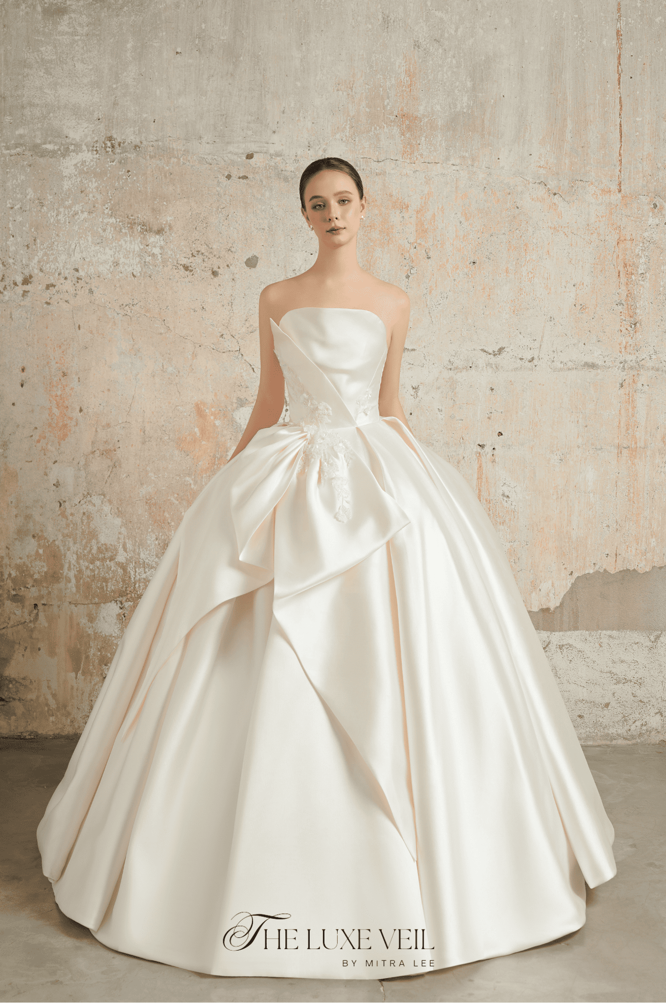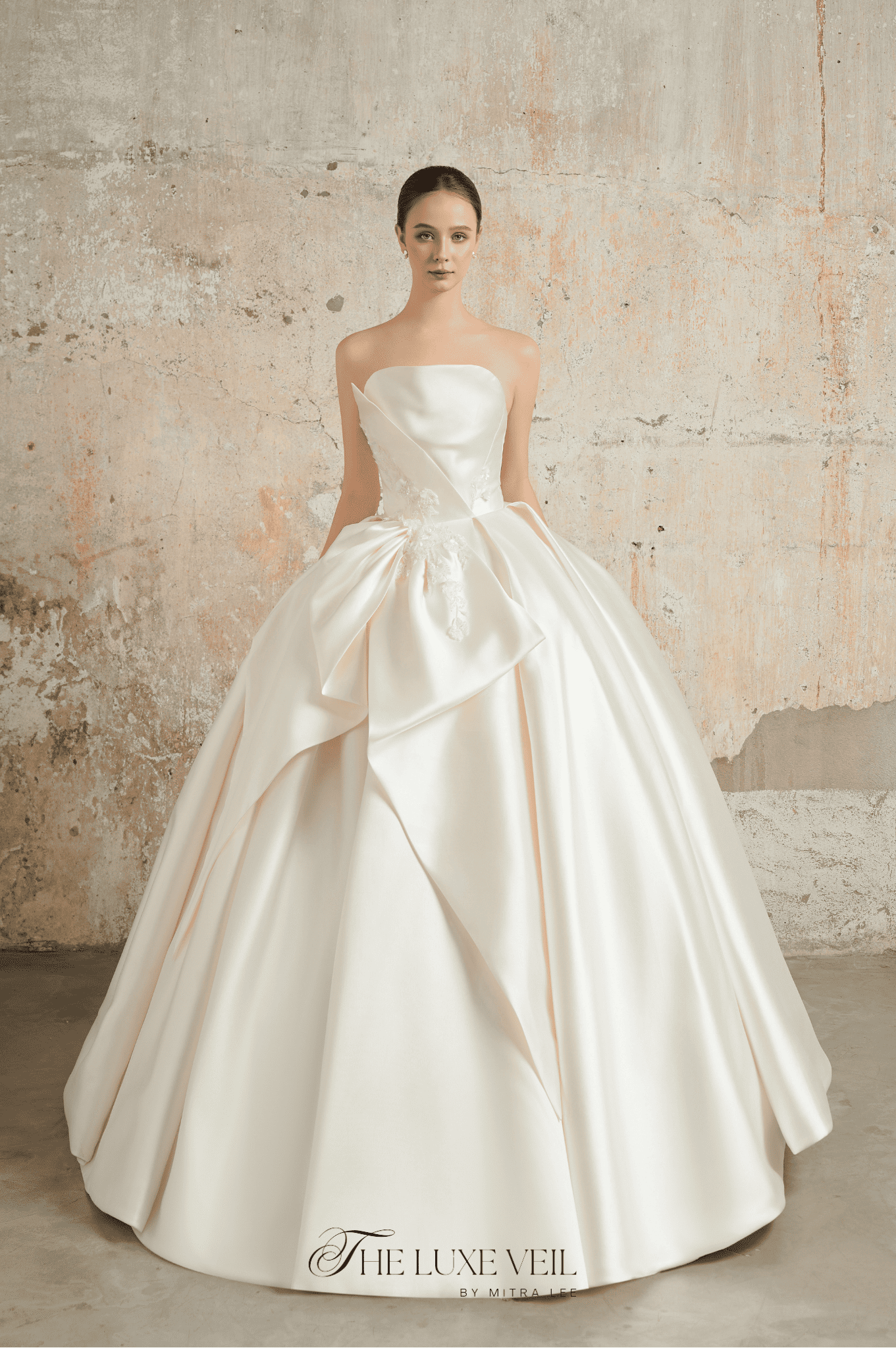 The stepped into the room, a vision of timeless grace, as if she had emerged from the pages of a fairytale. The Ethereal Whisper gown, with its cascading folds of ivory satin and delicate floral appliqués, seemed to carry the soft glow of moonlight. Each detail, from the structured bodice to the flowing veil adorned with lace, whispered of romance and eternity. This gown isn’t just a dress, it’s a promise of forever, a dream woven into fabric, and a masterpiece for a bride who dares to enchant the world.