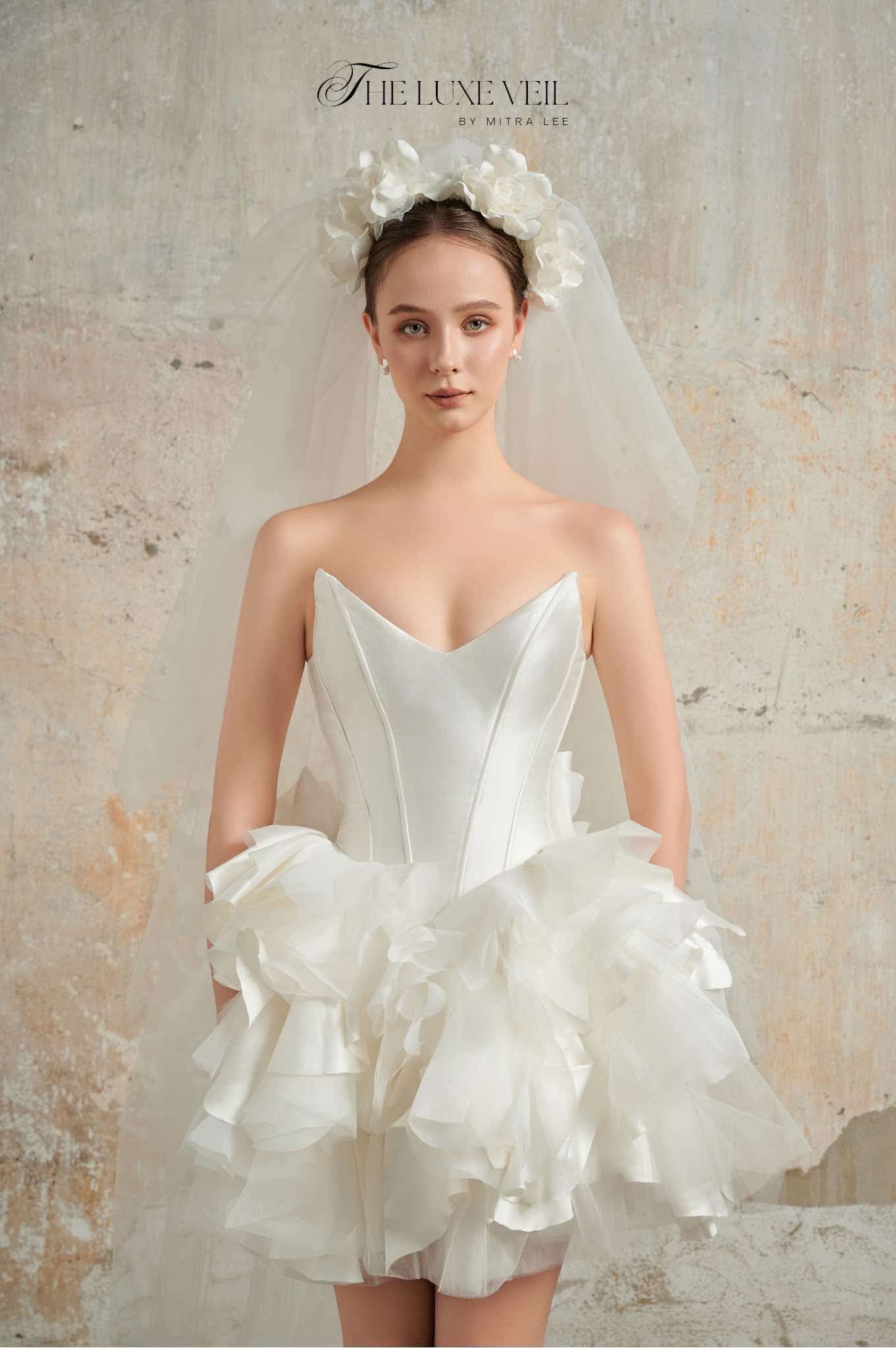 For the bride who dances to her own rhythm, The Blossom Ballet is a celebration of grace, charm, and playful sophistication. Its sculpted bodice whispers elegance, while the cascading layers of soft ruffles evoke the petals of a blooming rose. Crowned with a delicate floral veil, this dress is for the modern bride who wants to twirl through her day with light-hearted beauty. It’s more than a gown, it’s a symphony of romance and individuality. Let your love story unfold in The Blossom Ballet