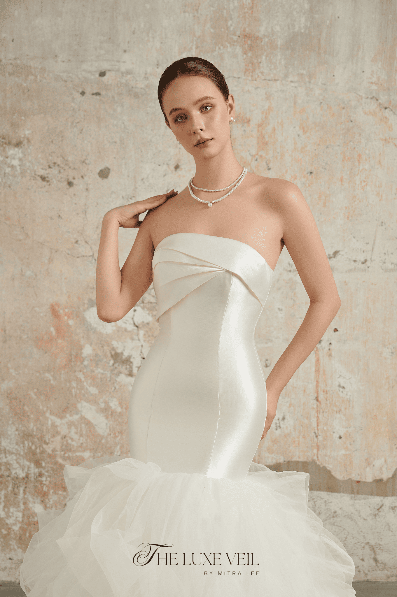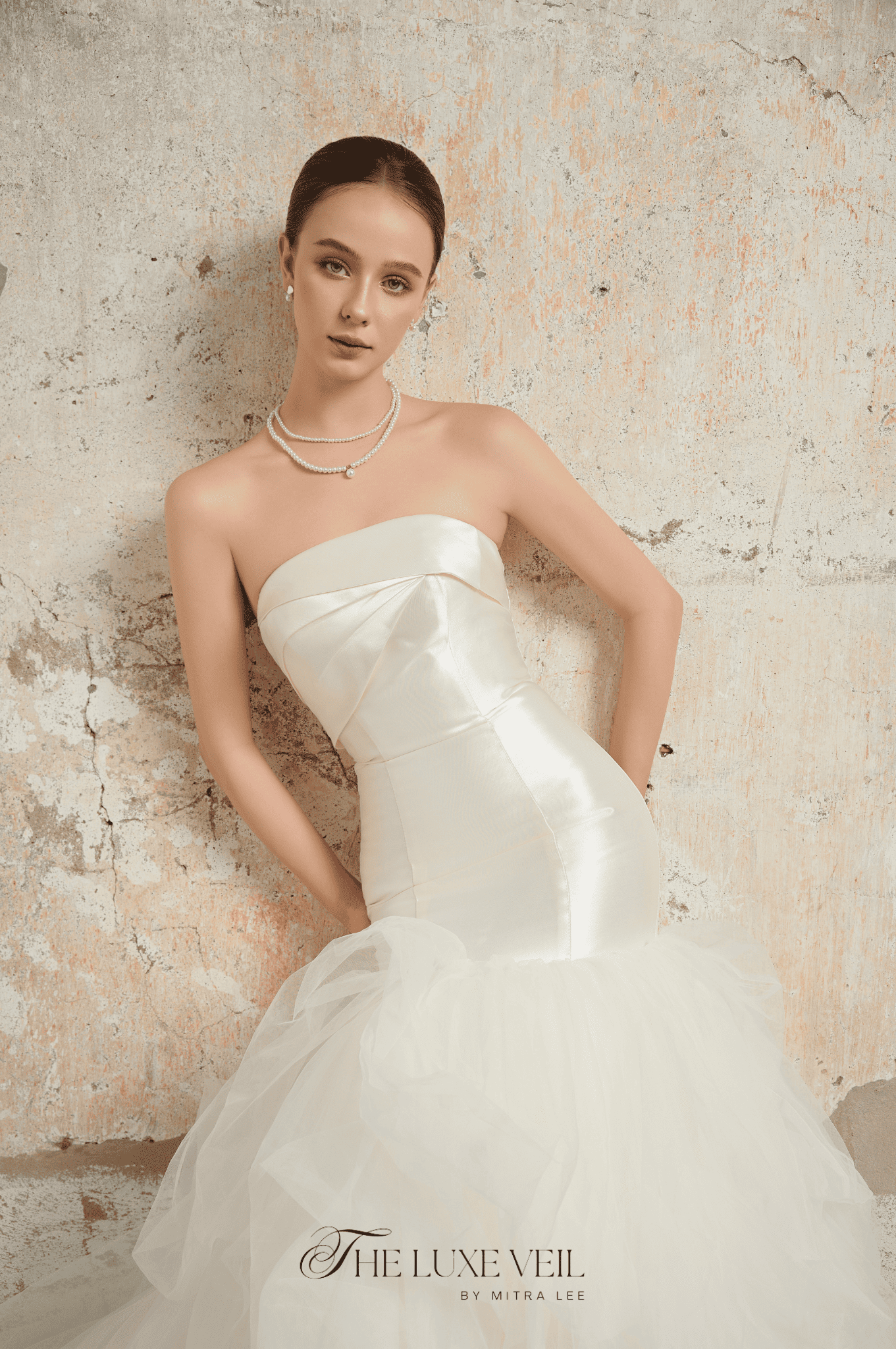 Simplicity speaks volumes in this strapless mermaid gown, meticulously crafted to highlight your natural beauty. The structured bodice features subtle detailing that radiates sophistication, complemented by layers of airy tulle for a touch of dreamlike charm. Pair it with a classic pearl necklace to complete your look of effortless grace. Perfect for the bride who believes in less is more and elegance is forever.
