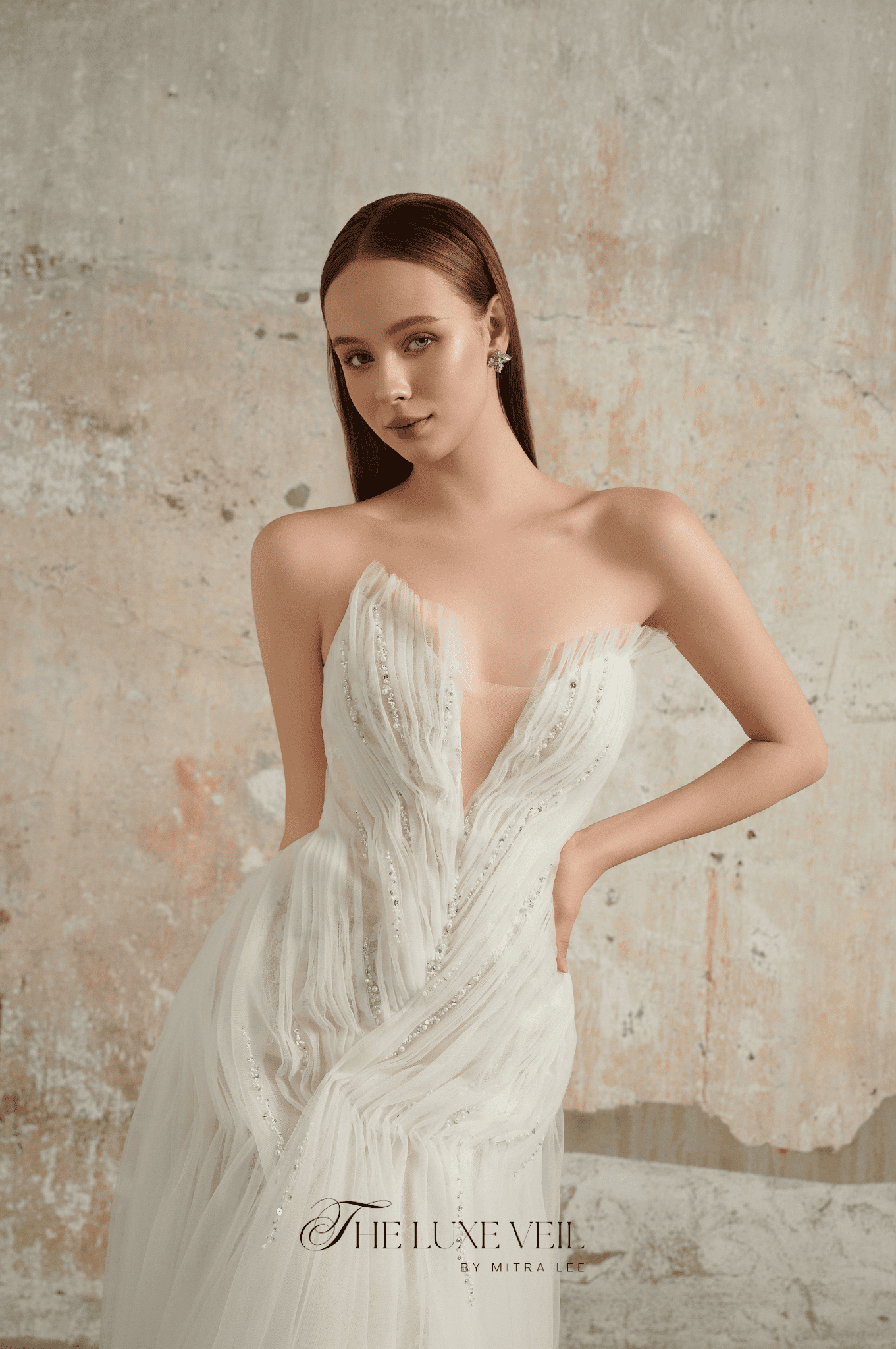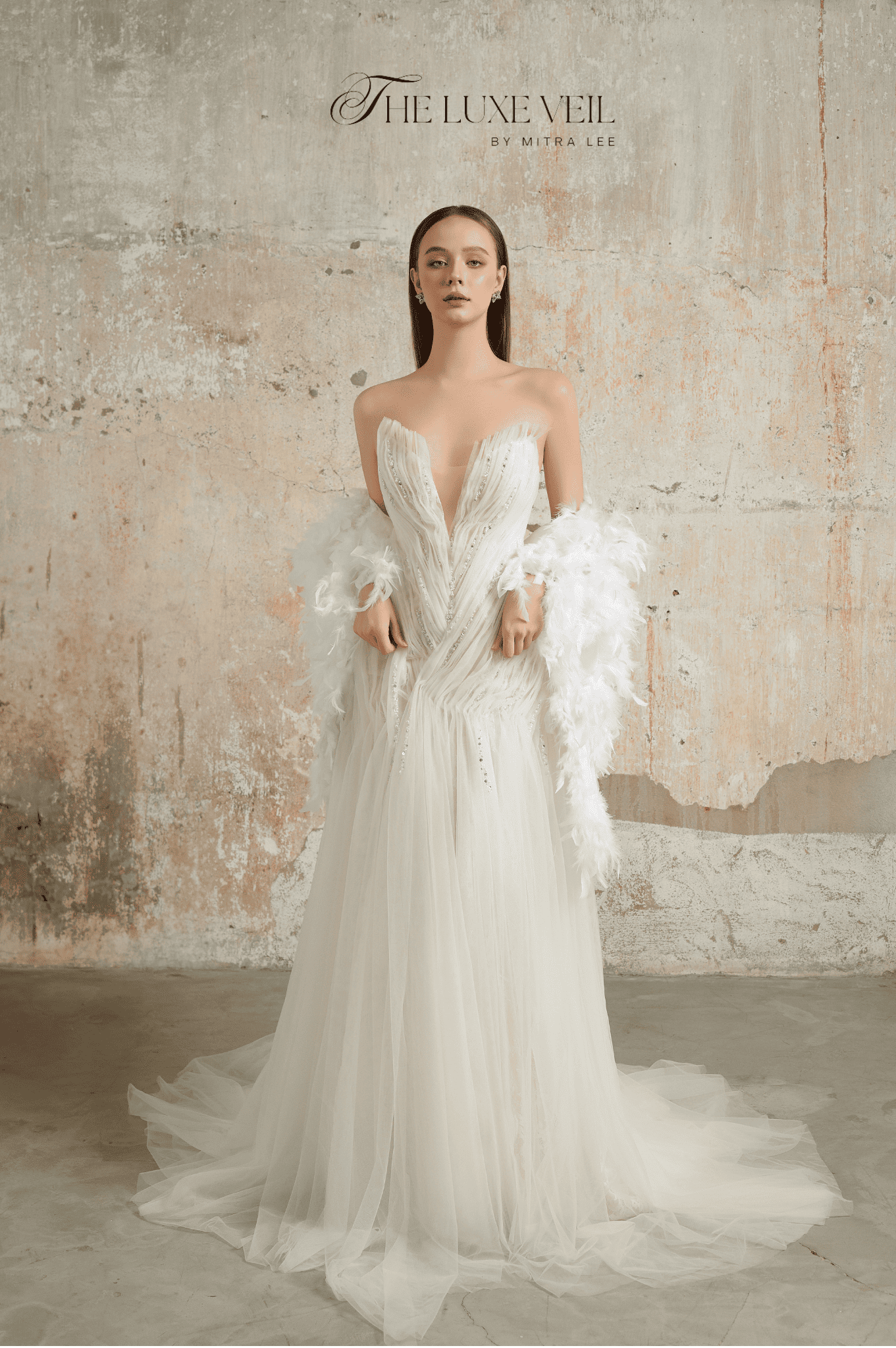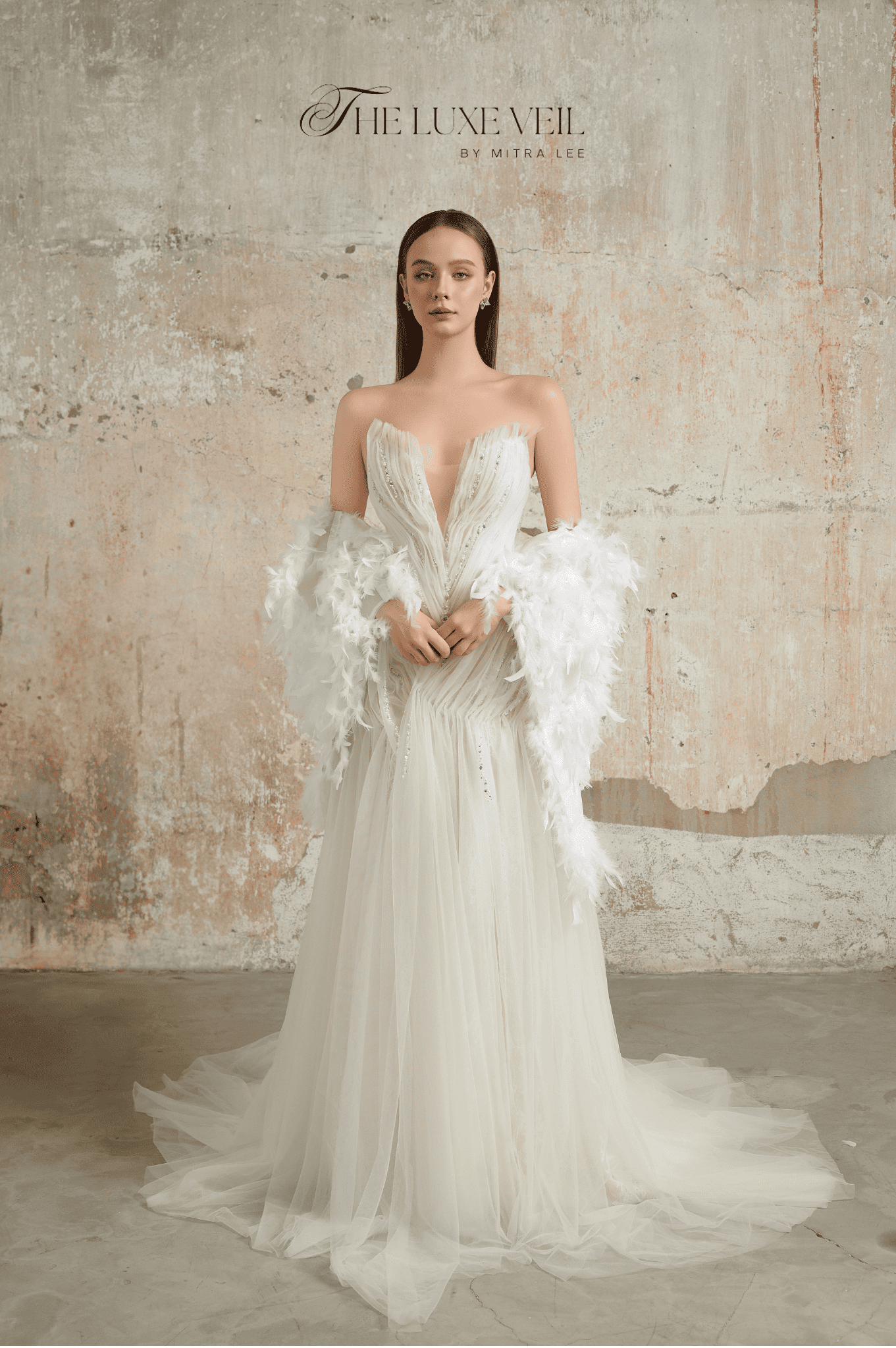 Introducing The Feathered Grace, a gown that captures the essence of weightless beauty. Its exquisite feather-like details delicately cascade along the silhouette, symbolizing the bride’s ability to rise above and embrace her dreams. The shimmering beadwork adds a touch of starlit magic, while the sheer neckline creates an ethereal allure. This gown is a poetic blend of freedom and sophistication, perfect for the bride who wishes to float through her day with elegance and charm. Step into your fairytale and let The Feathered Grace carry you effortlessly to your happily ever after ✨
