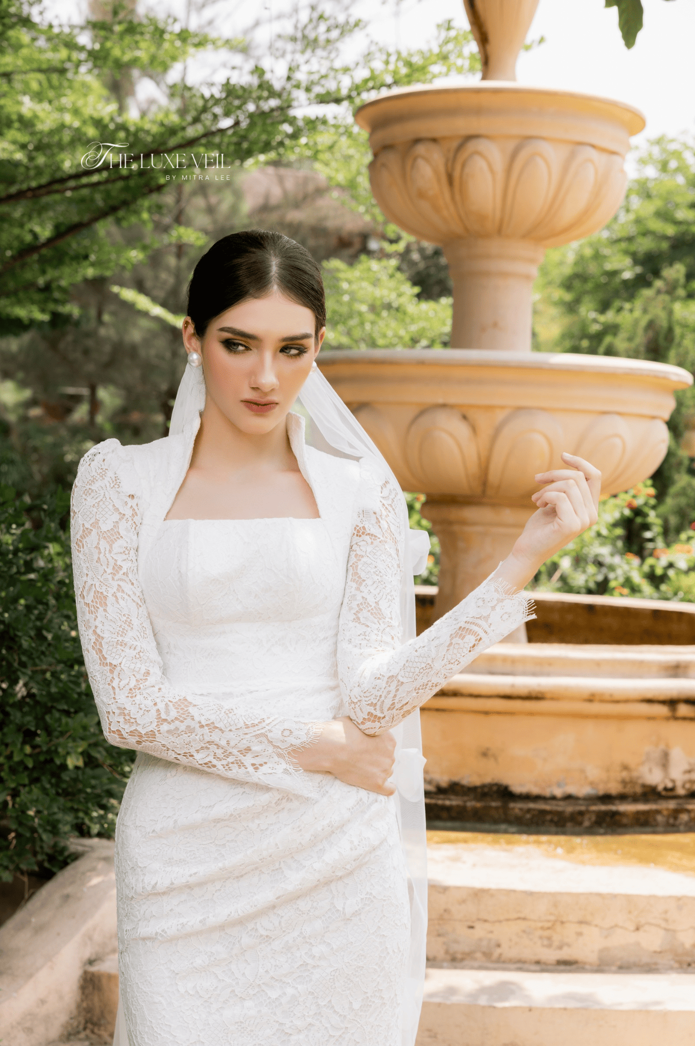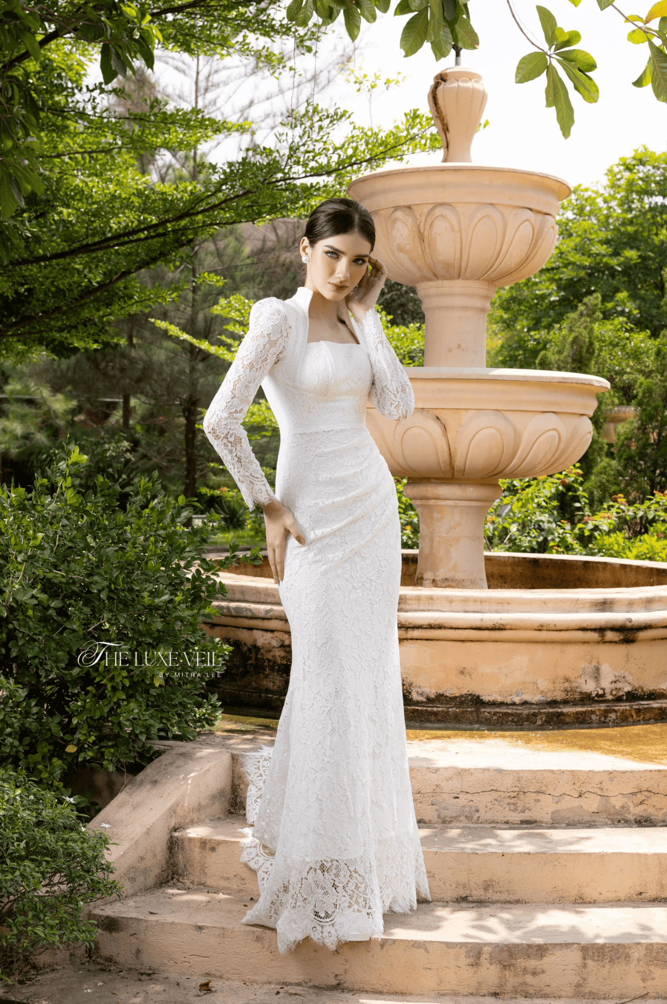 This is a tribute to timeless sophistication and modern grace. Designed for the confident and elegant bride, Vivienne features a structured silhouette crafted from delicate floral lace, exuding both classic charm and contemporary refinement. The square neckline and fitted bodice accentuate the natural curves, while the long lace sleeves and tailored bolero jacket add a regal touch. The intricate lace detailing throughout the dress creates a sense of vintage romance, complemented by a flowing veil that enhances the bridal aura. Vivienne is perfect for the bride who seeks a balance between tradition and bold individuality, making an unforgettable statement of grace and strength.