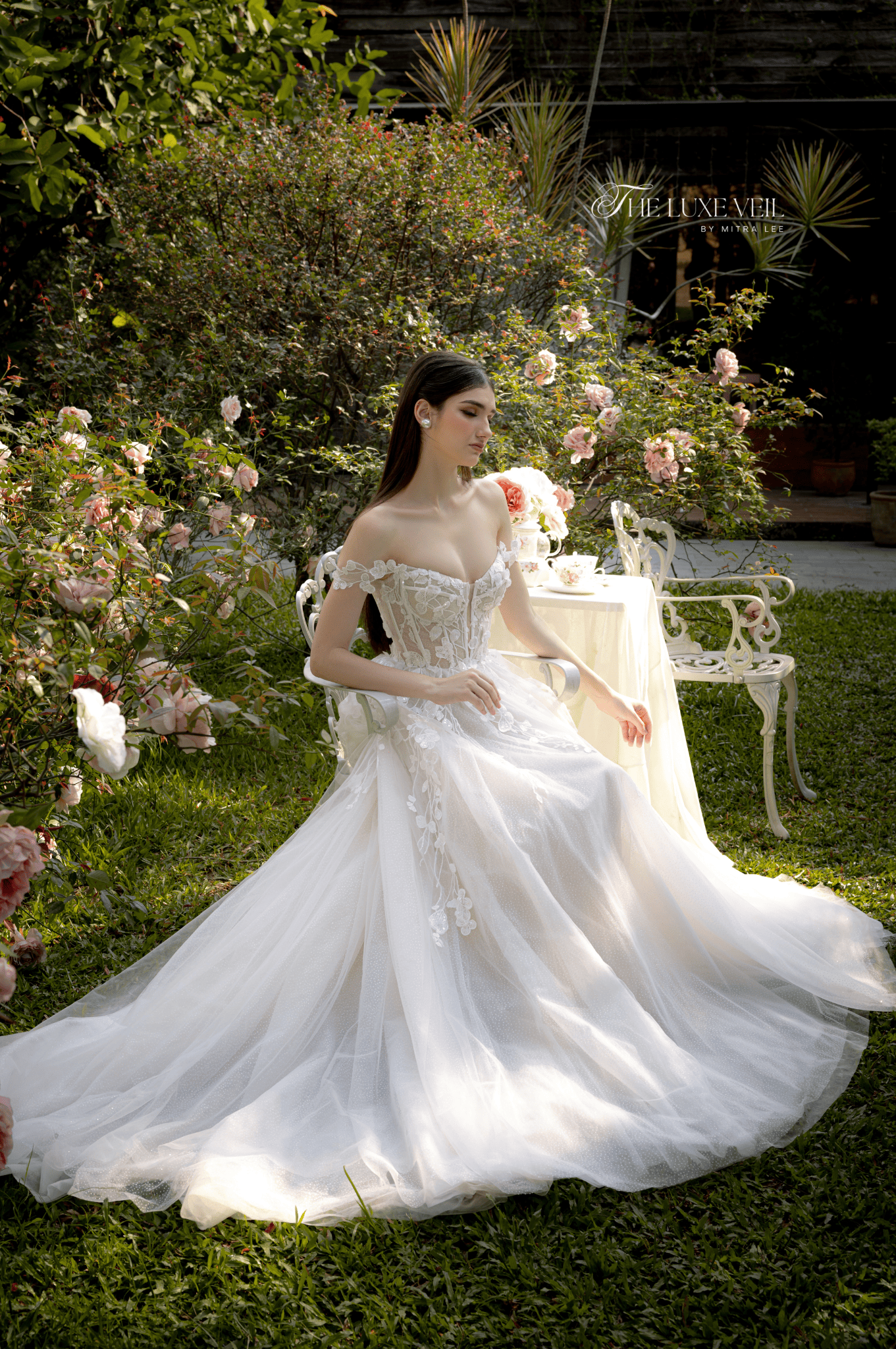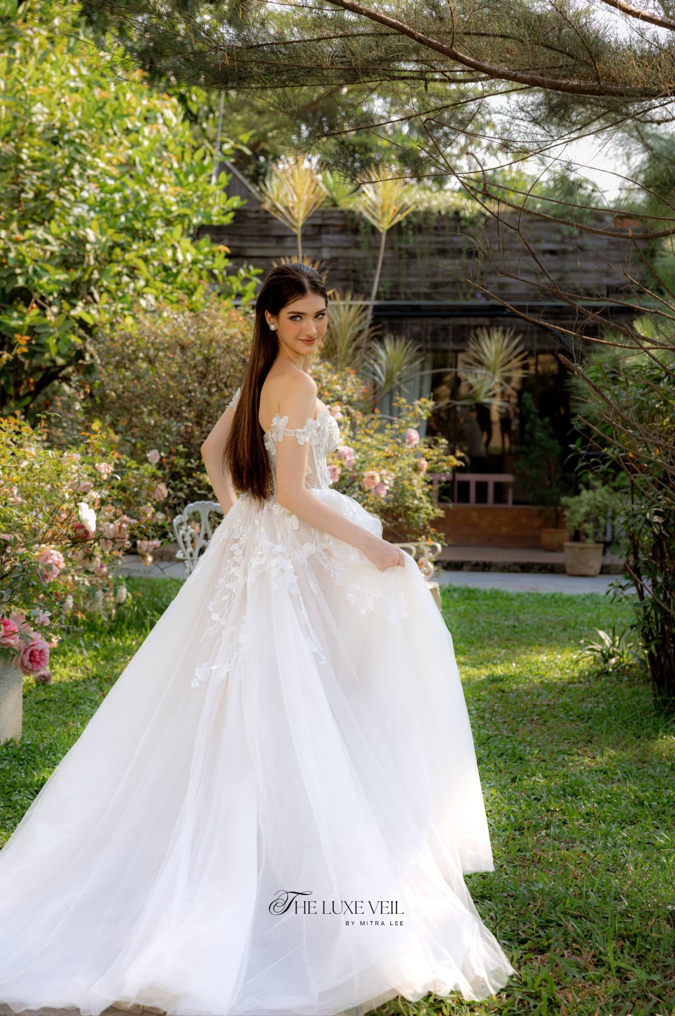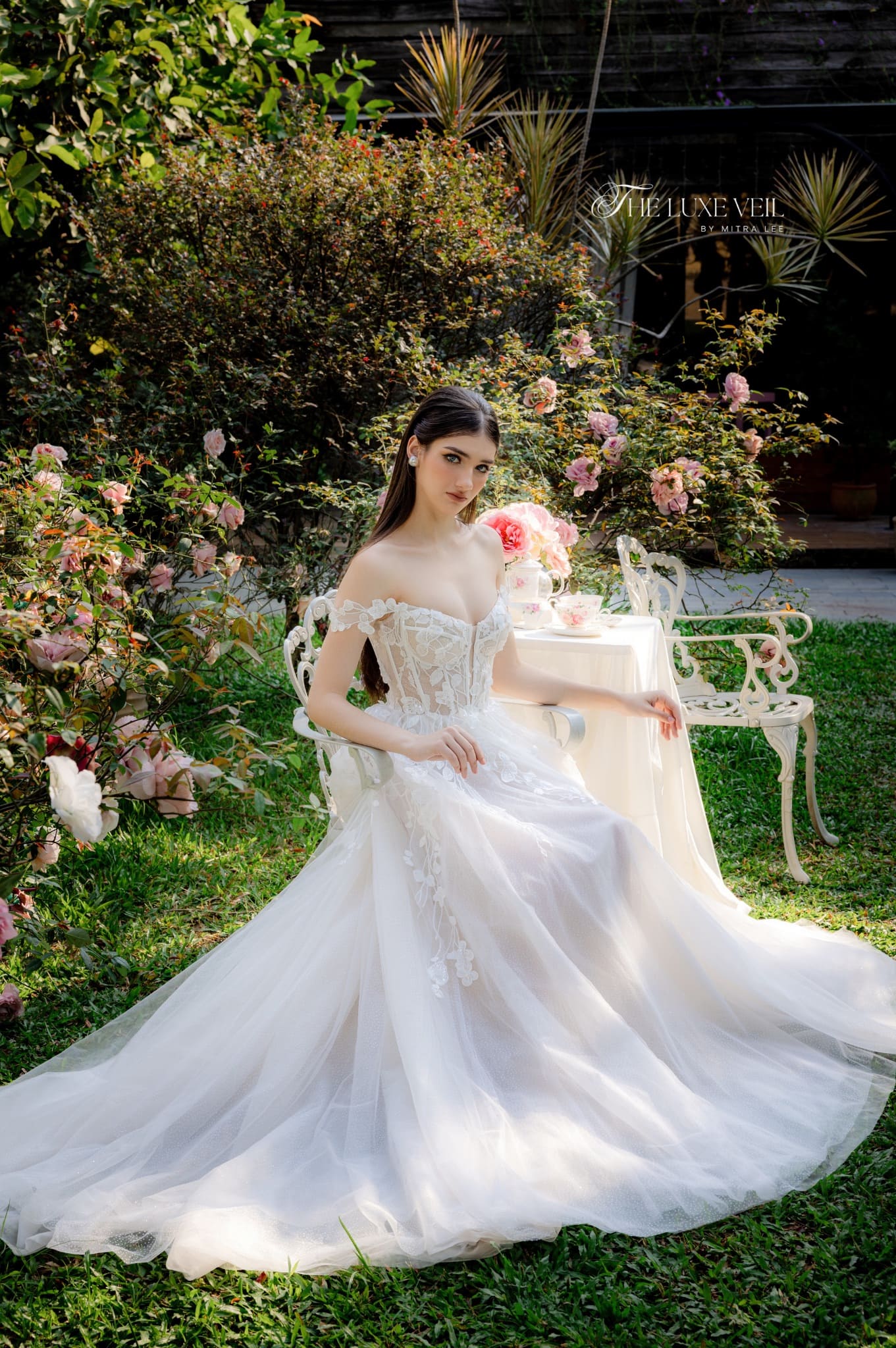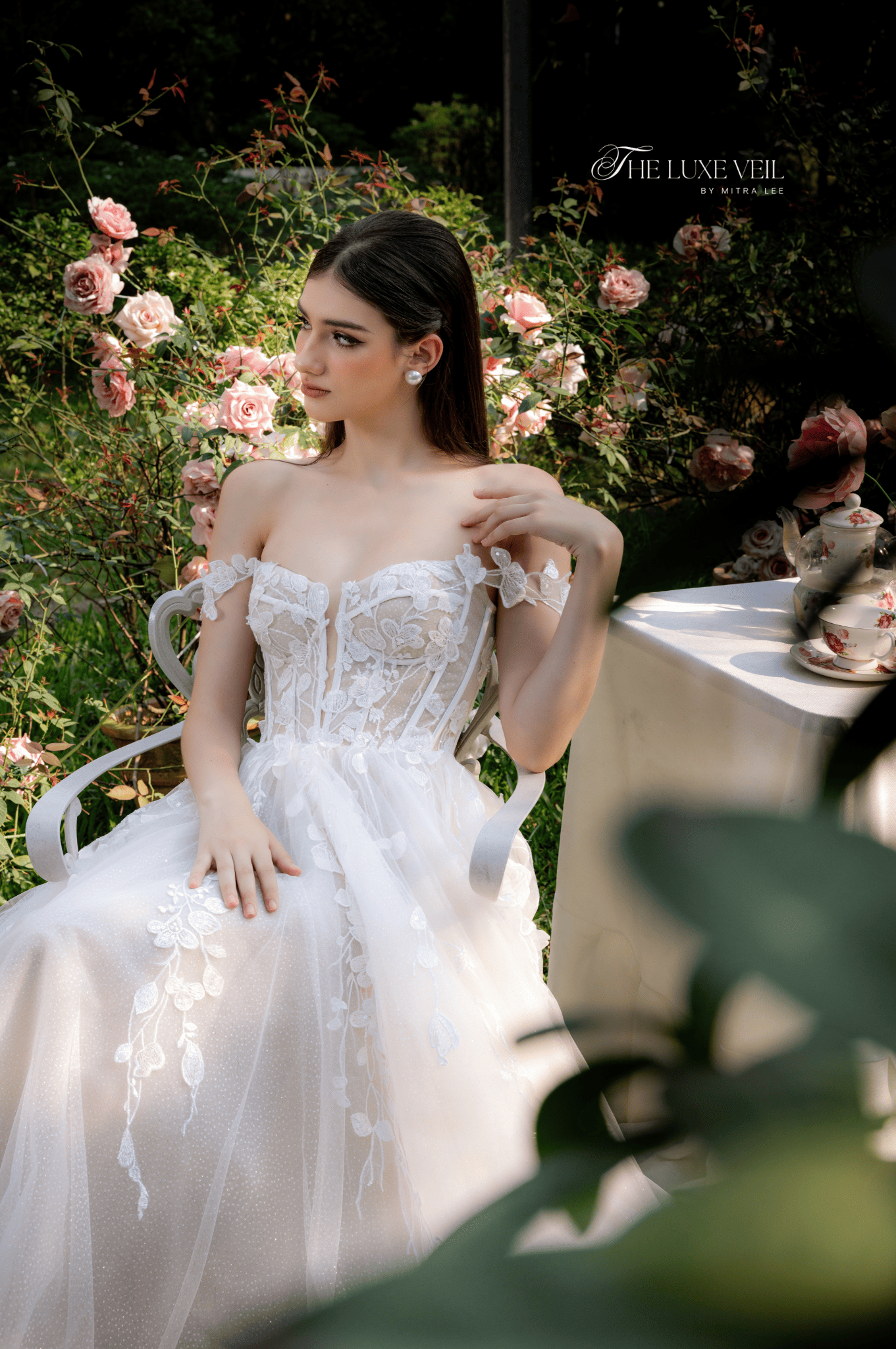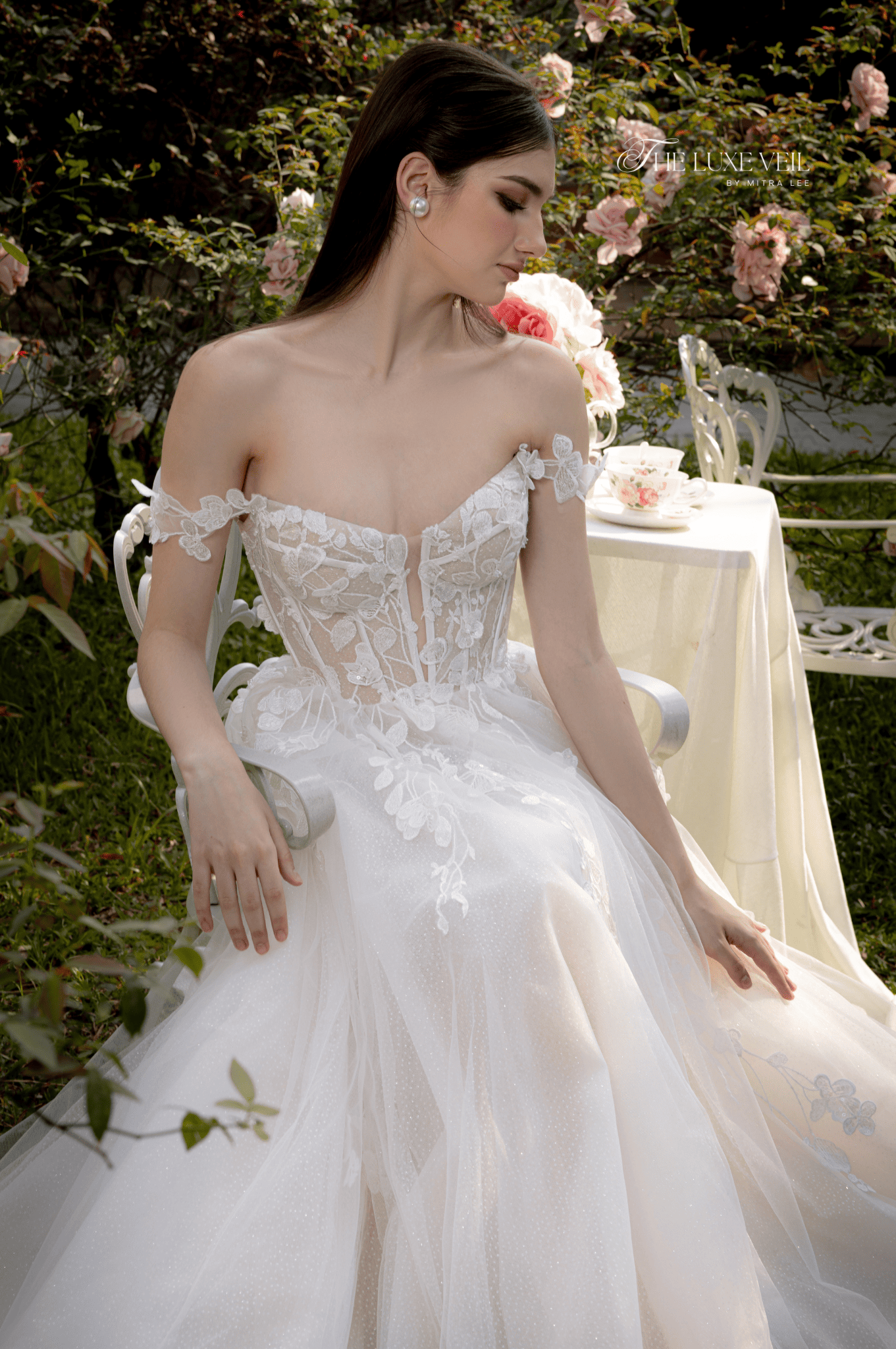 Aurelia is the gown that speaks in whispers of romance. Its sheer corset bodice is adorned with delicate, vine-like embroidery that climbs along the décolletage and tenderly wraps the arms in off-shoulder floral straps. The tulle skirt flows like a waltz, airy and luminous, catching every beam of light with an angelic shimmer. With every petal and layer, Aurelia captures the tender beauty of a garden in bloom and the timeless glow of a bride in love. It’s a gown made for quiet mornings, for soft-spoken vows, for the kind of elegance that doesn’t try to impress, only to enchant.