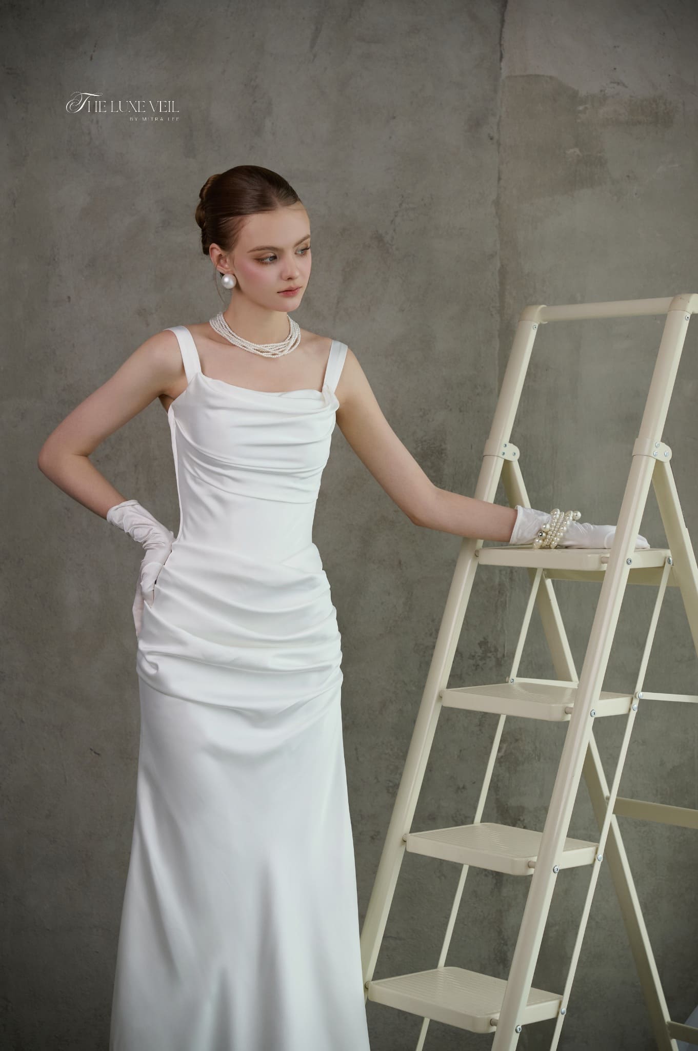 Minimalist in form yet magnetic in presence, Sylvette is designed for the bride who believes elegance lies in simplicity. Crafted from sleek satin, the gown features a softly draped neckline and structured straps that flow into a perfectly contoured silhouette. Gentle ruching along the bodice adds subtle dimension, while the column skirt elongates the figure with timeless grace. Styled with pearls and gloves, Sylvette whispers old-Hollywood sophistication while remaining effortlessly modern, a gown that celebrates refined beauty without excess.