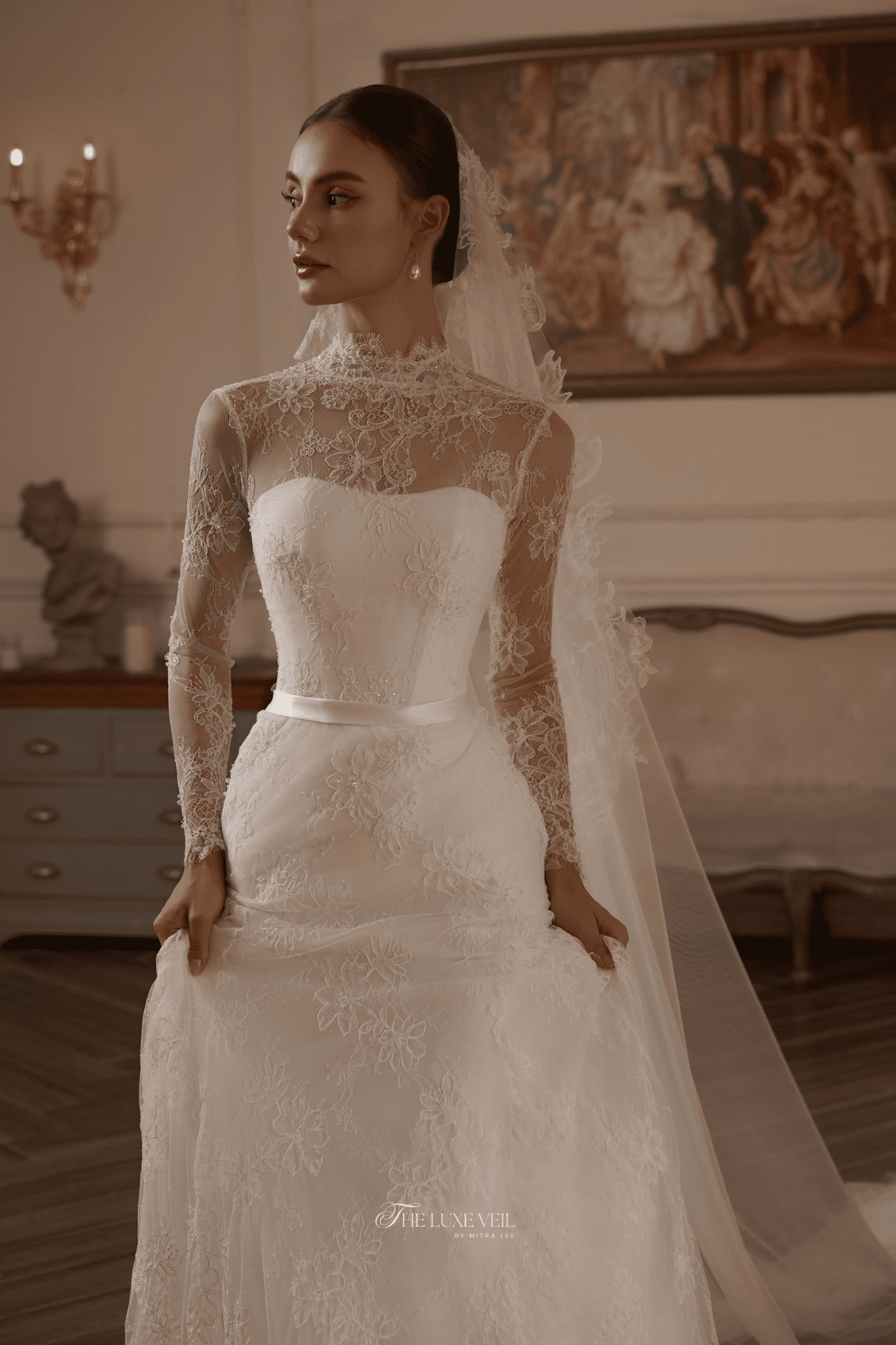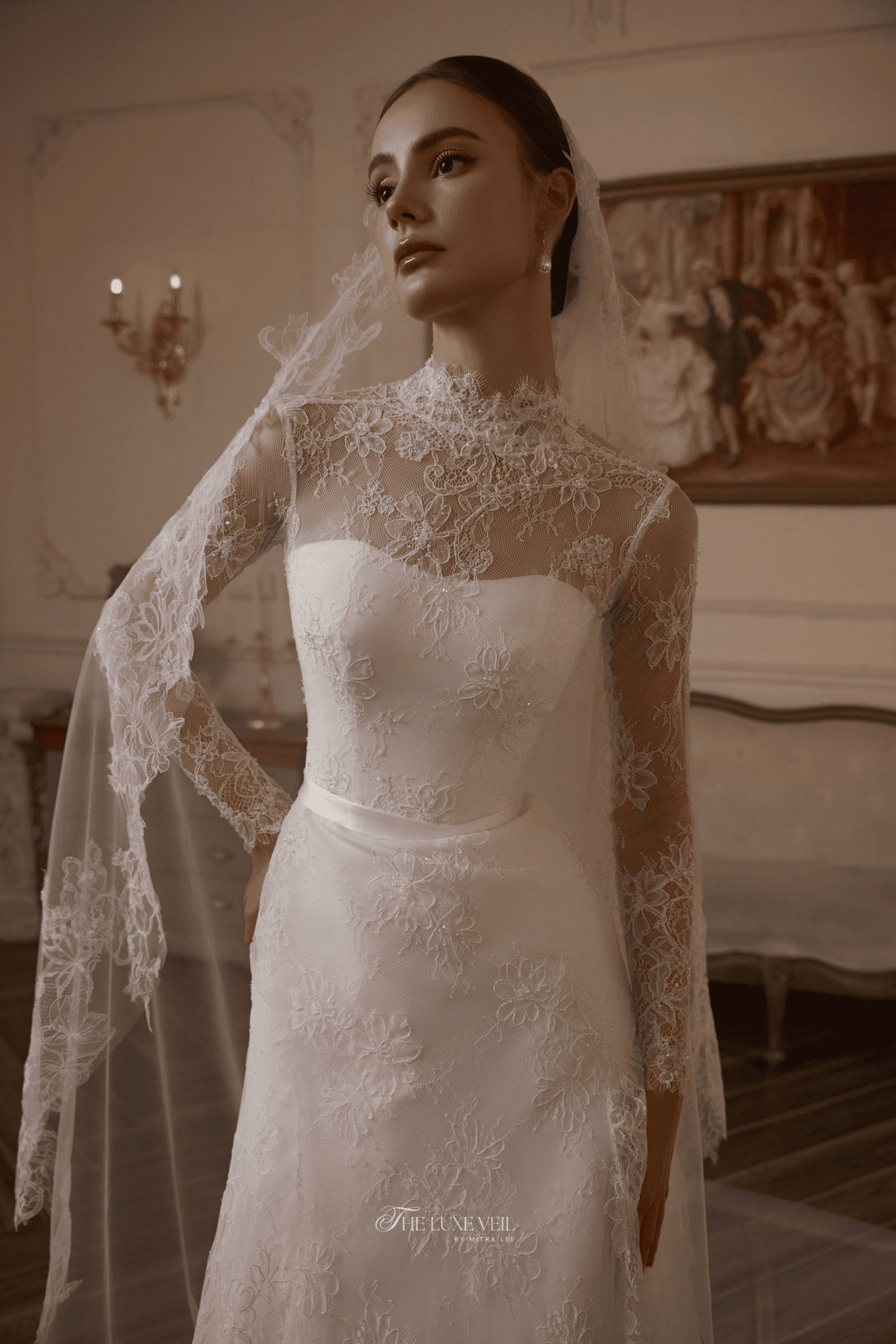 Alexandrine is royalty in its most graceful form. Intricate lace rests softly against the skin, composed and deliberate, as if shaped for grand halls and quiet vows alike. The high neckline and long sleeves create a regal frame, while the refined silhouette moves with calm authority: elegant, poised, and unwavering. Her veil falls like a royal decree, light yet commanding, completing a look that feels ceremonial, dignified, and timeless. Alexandrine is for the bride who carries strength with softness. She does not seek the spotlight, it follows her naturally.