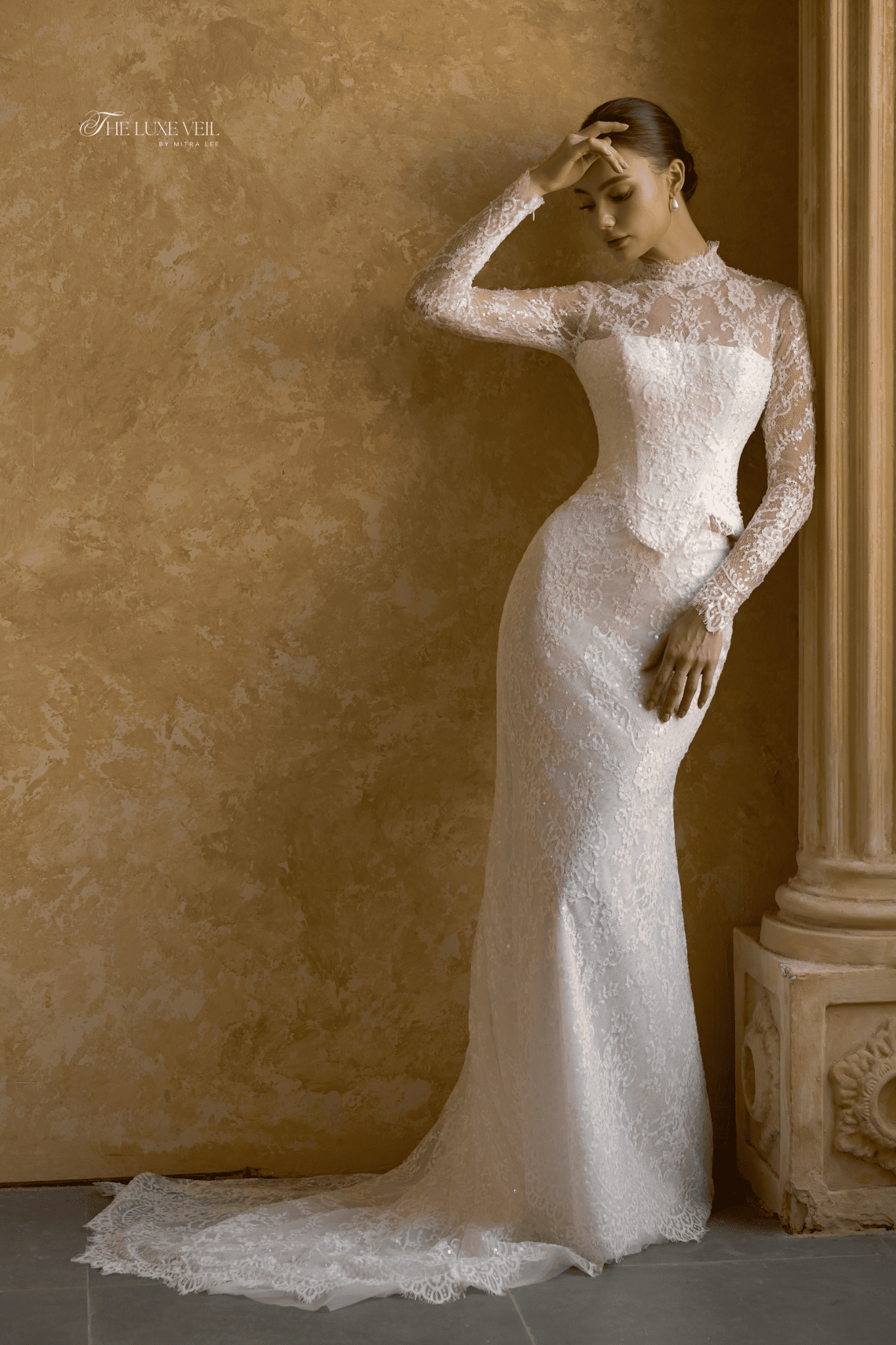 Marguerite is a love story told in quiet details. Delicate lace drapes the body with a softness that feels almost timeless, as if the gown has lived many beautiful moments before this one. Her high neckline and long sleeves speak of grace and restraint, while the sculpted waist gently shapes the silhouette, balancing tradition with femininity. When the overskirt falls into place, Marguerite transforms, subtle, ceremonial, and effortlessly elegant. Marguerite is for the bride who believes romance doesn’t need to be loud. She stands calmly, confidently, and lets love unfold at its own pace.